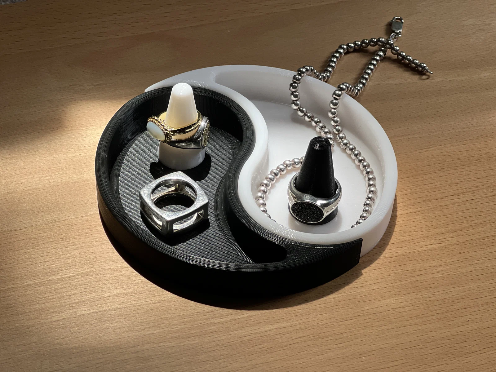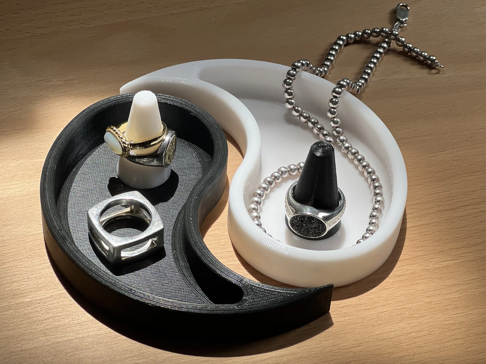 Giá đỡ nhẫn Yin Yang vừa đẹp vừa tiện, giúp trưng bày nhẫn và trang sức gọn gàng. Hai nửa ghép khít thành vòng tròn, dễ phân loại đồ vàng/bạc hoặc của anh/chị. In nhanh khoảng 5 giờ với 15% gyroid infill.