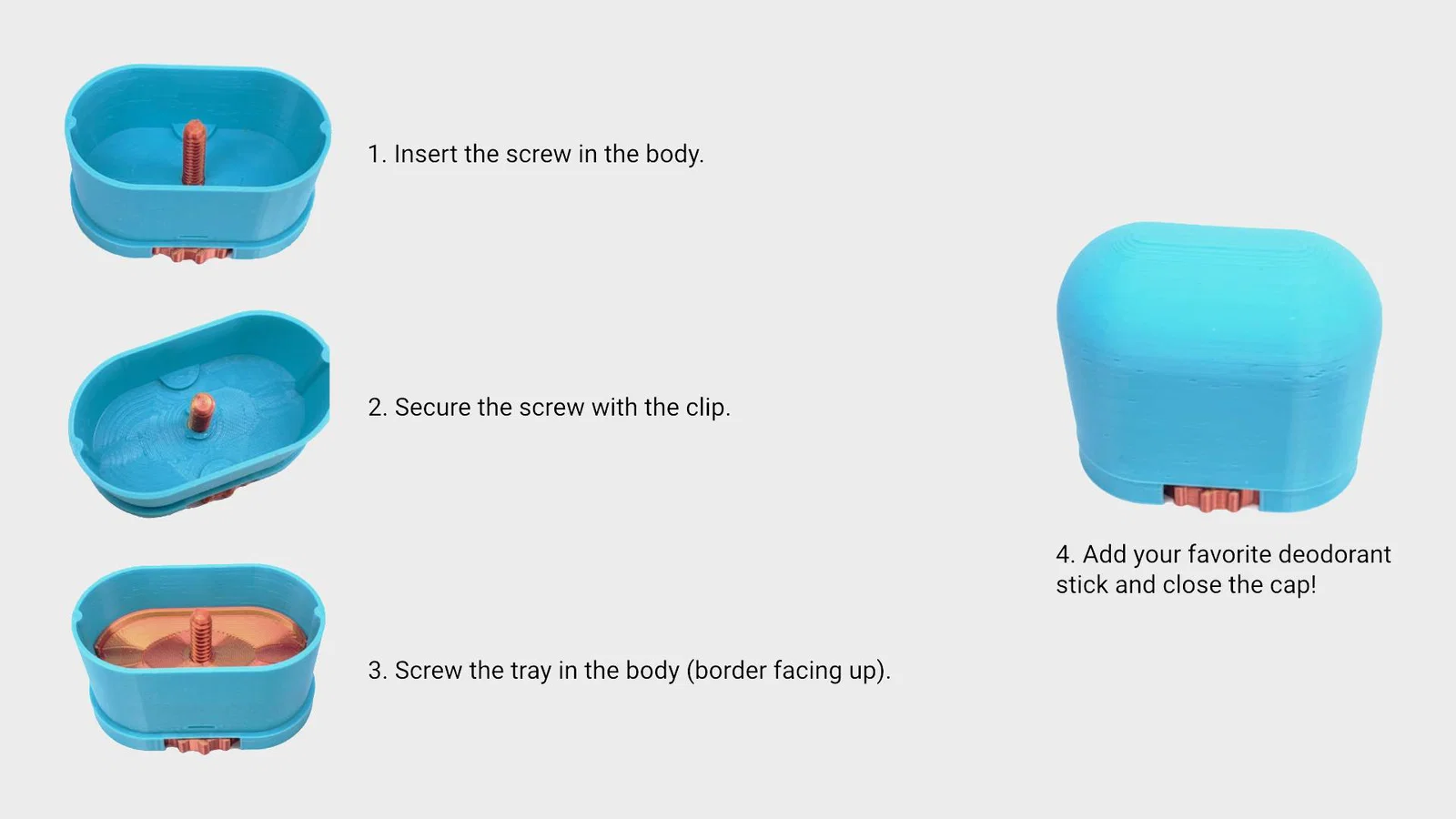 - Cấu tạo chi tiết: Bộ sản phẩm bao gồm đầy đủ nắp (cap), thân (body), vít (screw), kẹp (clip) và khay (tray), mô phỏng chuẩn xác cơ chế của một thỏi lăn khử mùi chuyên nghiệp.
