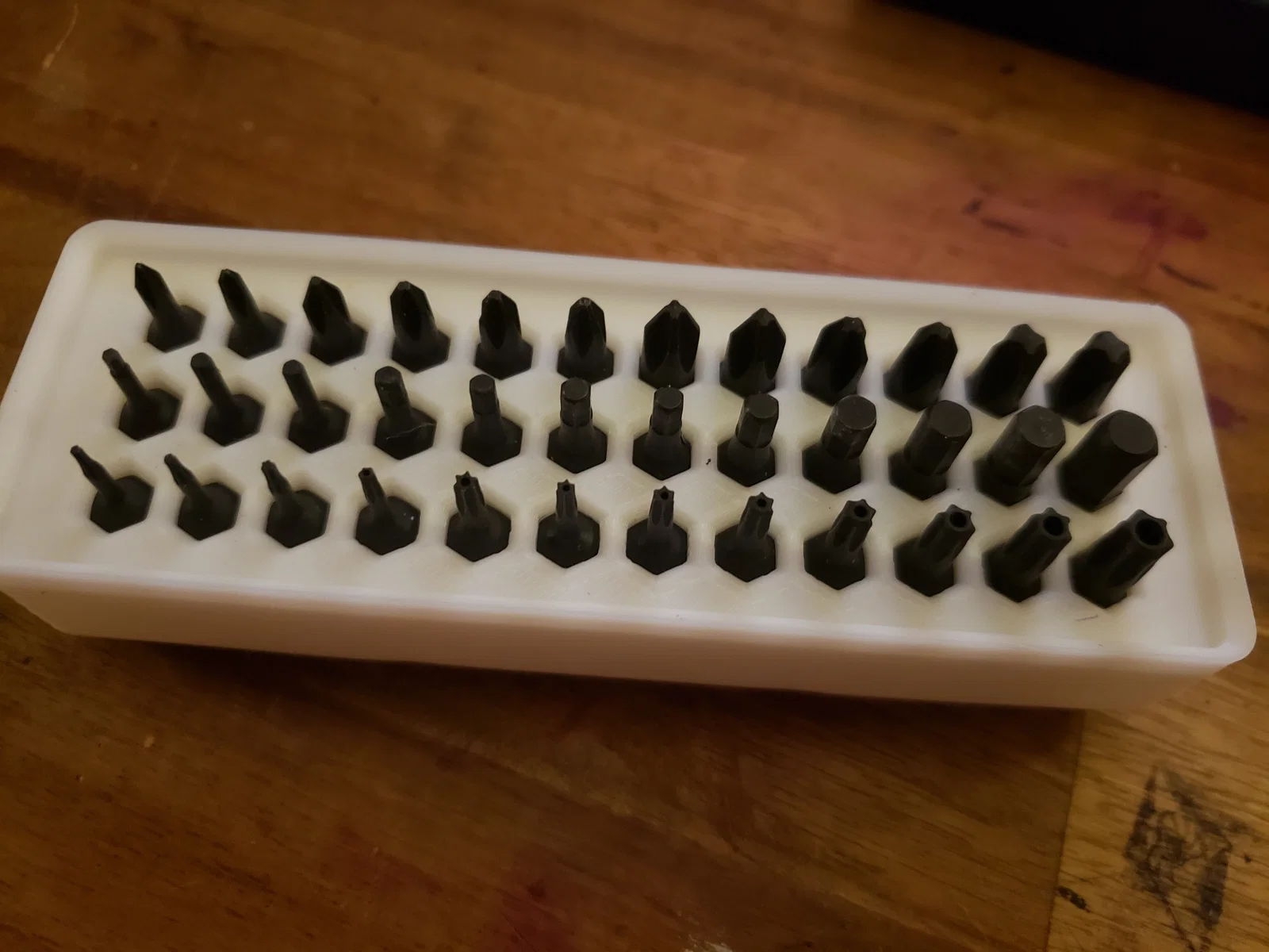 Với khả năng chứa lên đến 36 mũi vít khác nhau, chiếc khay này là giải pháp hoàn hảo để quản lý bộ sưu tập đầu vặn của anh em một cách khoa học. Thay vì để các mũi vít nằm lộn xộn trong hộp nhựa gốc, giờ đây anh em có thể sắp xếp chúng theo thứ tự hoặc nhóm công việc để thao tác nhanh hơn. Thiết kế này tận dụng tối đa diện tích bề mặt, tạo vẻ ngoài gọn gàng, chuyên nghiệp cho góc làm việc của mình.