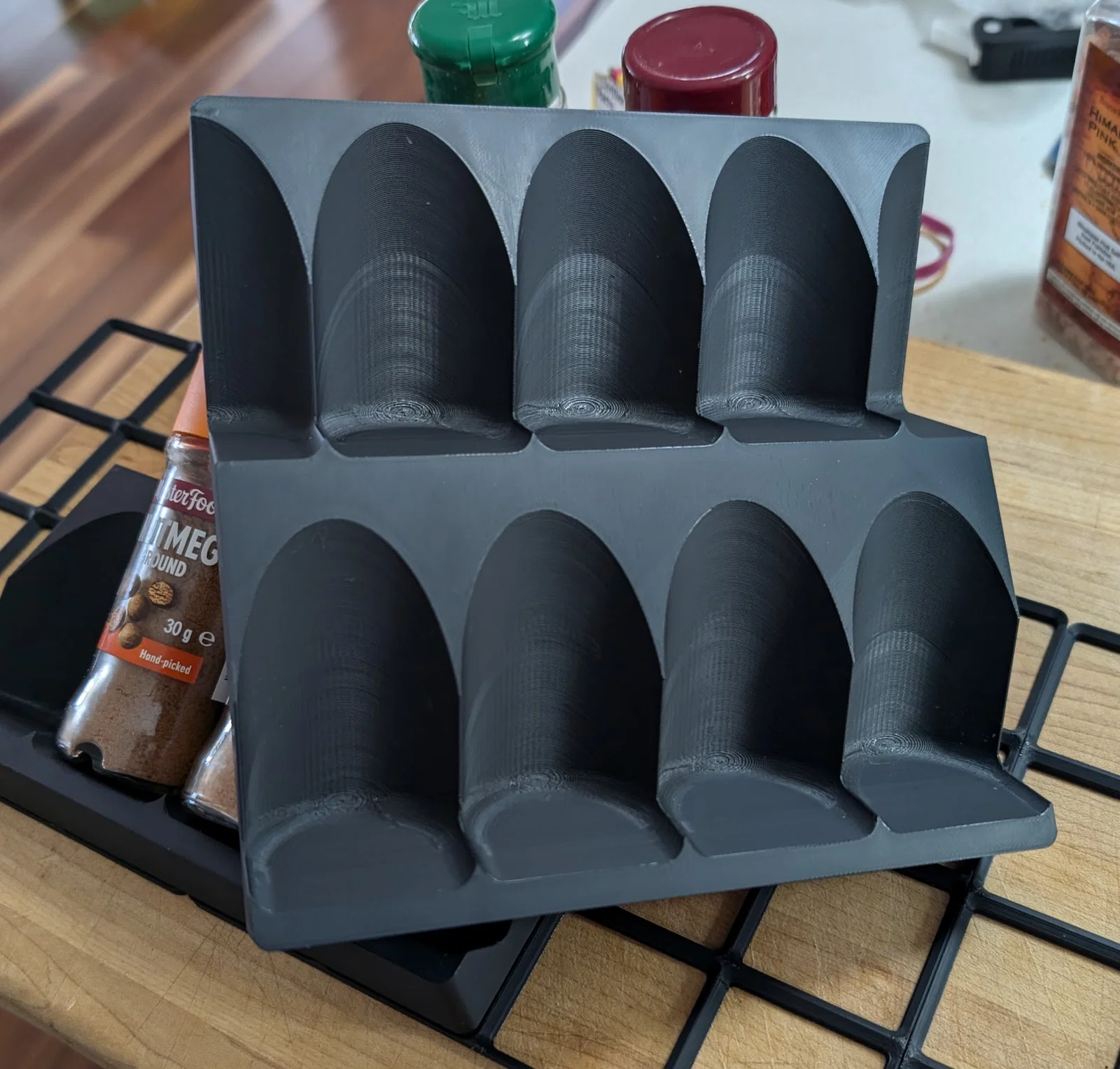 Kệ/khay sắp xếp hũ gia vị theo hệ Gridfinity dành cho ngăn kéo, giúp các hũ luôn nhìn thấy rõ nhưng vẫn vừa dưới giới hạn chiều cao 100mm. Hỗ trợ hũ cao tới 110mm, đường kính 42mm; có thêm bản cho nhiều hình dáng.