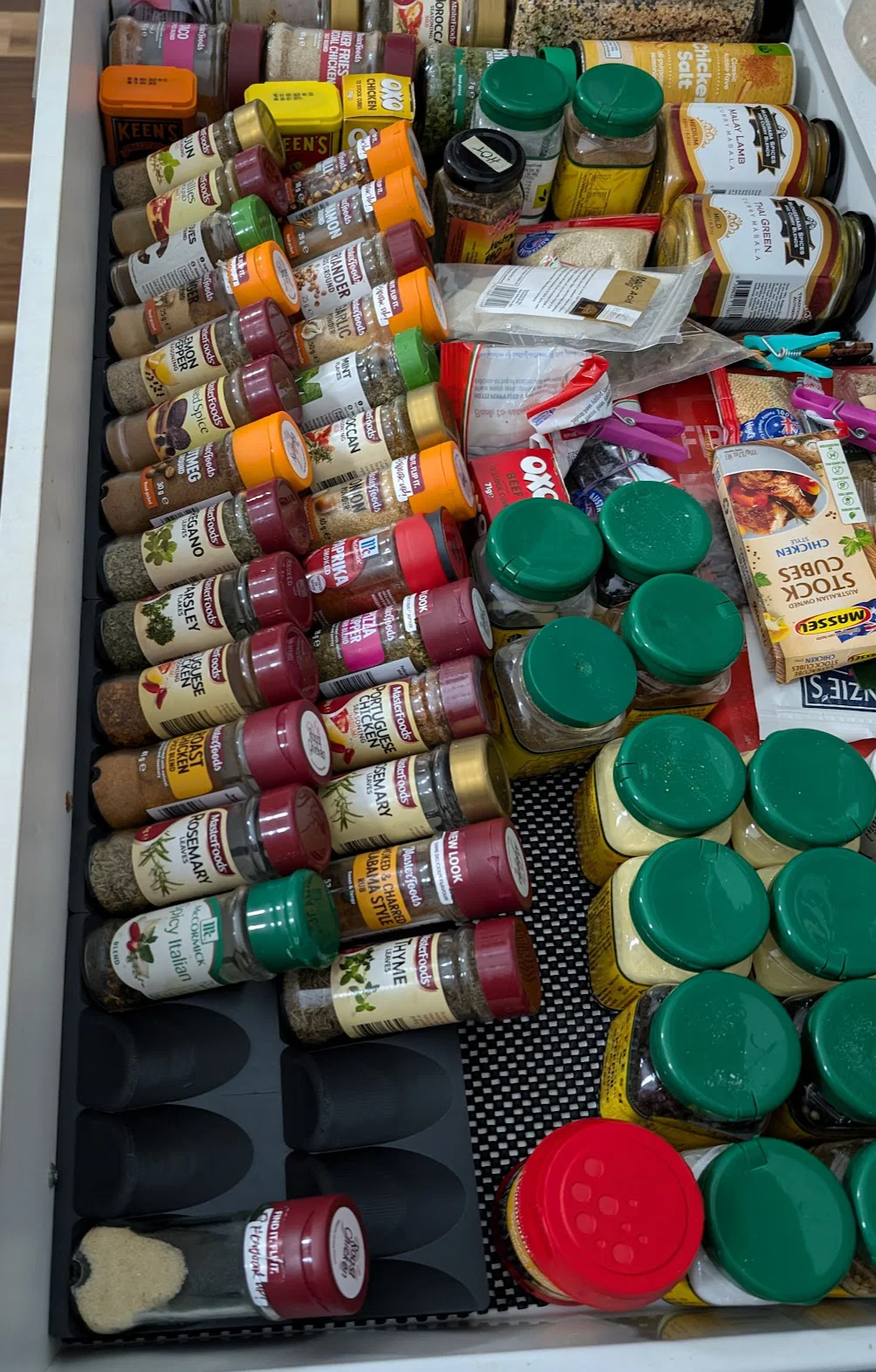 Mình muốn sắp xếp gọn gàng các hũ gia vị trong ngăn kéo sao cho nhìn thấy hết, nhưng vẫn trượt được dưới giới hạn chiều cao tối đa 100mm mình đang có.