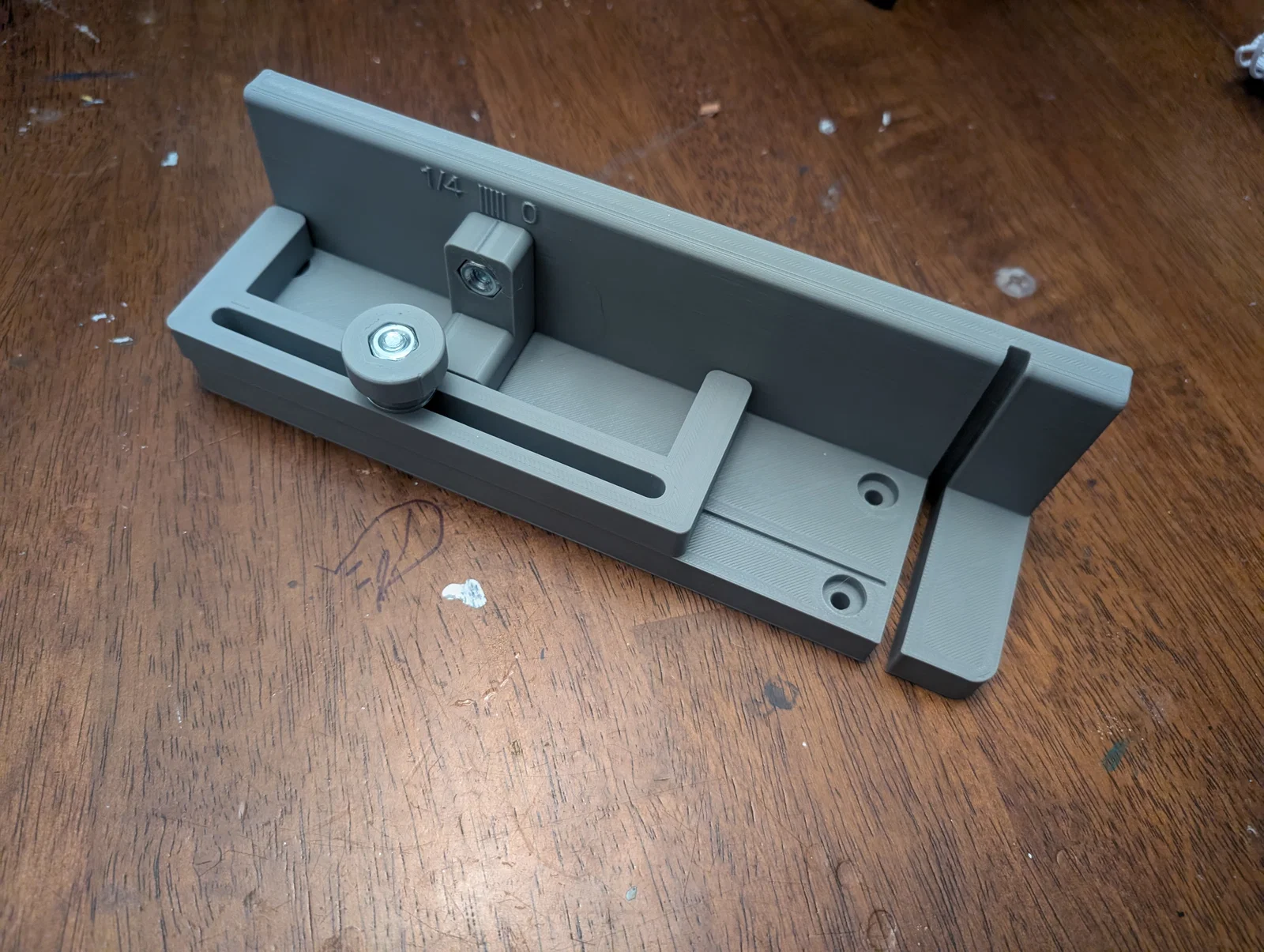 Trong base có model sẵn một “placeholder” cho con hex nut phía dưới. In xong bạn tách nó ra dễ dàng để nhét hex bolt từ bên dưới lên. Đặt hex bolt vào chỗ đó và xuyên qua đáy. Đặt fence lên trên, đảm bảo nó ngồi đúng vào rãnh trên base và hex bolt đi xuyên qua cái channel. Xỏ một washer lên bolt rồi gắn núm (knob) bạn chọn. Nếu bạn in núm model kèm theo, bạn cũng phải tháo cái placeholder của núm tương tự như ở base. Giờ thì bạn gần như đủ “nguy hiểm” với băng đảng tiện bút khét tiếng nhờ tốc độ và độ chính xác mới, nhưng cứ từ từ mà làm.