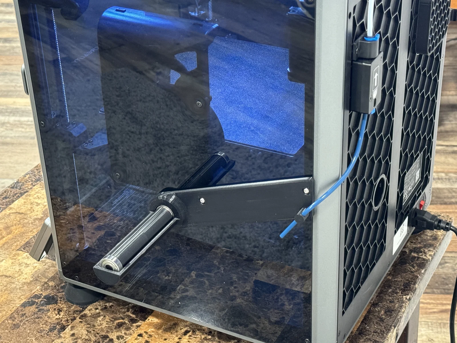 Mình lấy cái side mount mà MDFPereira đã thiết kế rồi chỉnh sửa lại để dùng kèm spool roller của mình. Ban đầu mình thấy bản CHEP dùng trên K1 Max. CHEP remix mẫu của MDFPereira để vừa với bản Max và có thêm một cái peg để luồn Bowden tube. Mình có thấy bản CHEP dùng trên K1 Max, ảnh thêm một cái peg để luồn Bowden tube. Mình thích ý tưởng dùng Bowden tube của CHEP, nhưng mình không muốn phải dời run out sensor, nên mình mới nghĩ ra cách này.