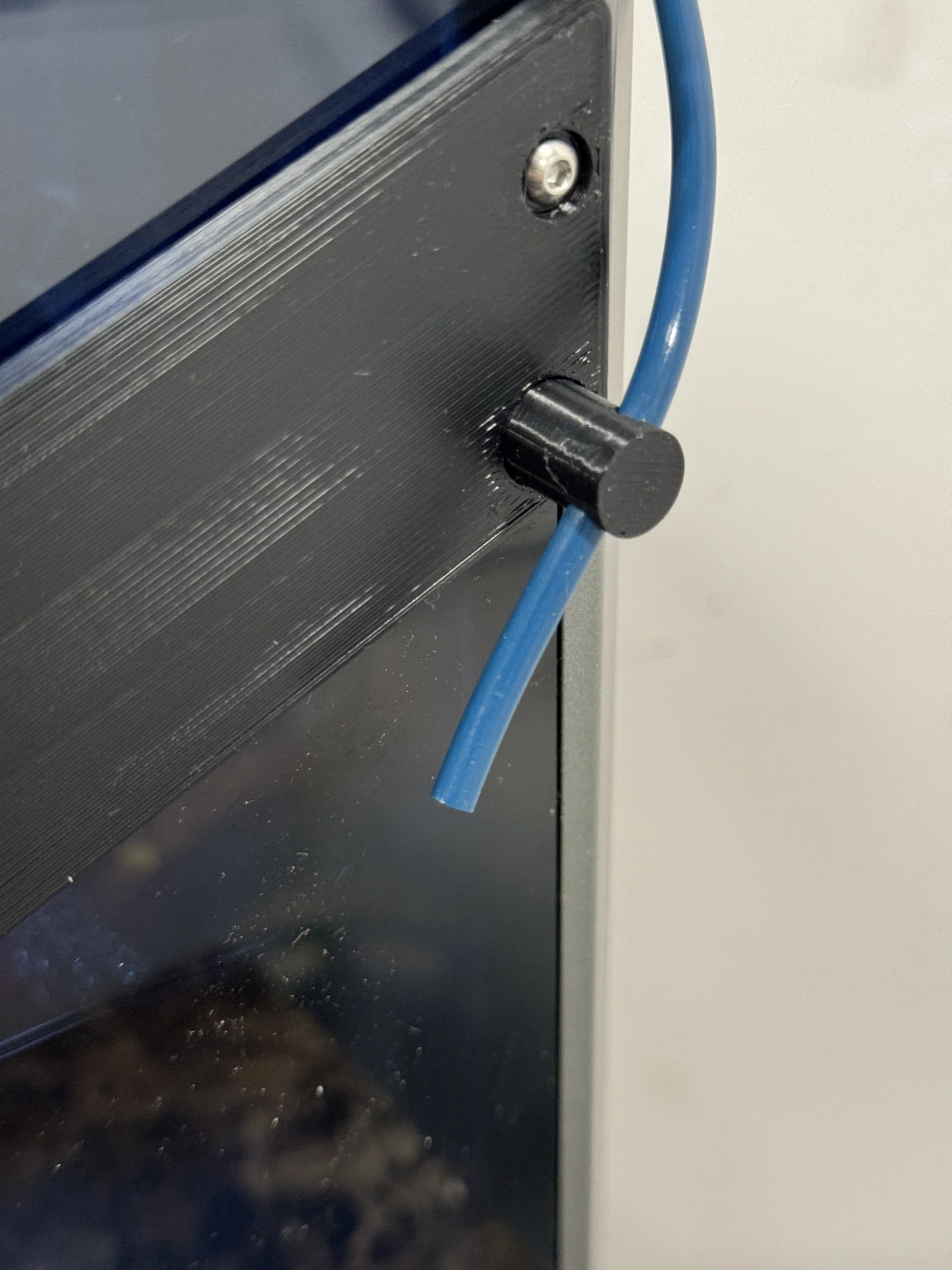 Cái peg trên mount của mình không cố định trong model, nó là Printed in Place và có thể xoay trơn sau khi bạn bẻ/tách cho nó rời ra. Mình thay đoạn Bowden tube ở dưới run out sensor bằng một đoạn dài 6.5 inch (165mm), rồi luồn qua lỗ trên peg (hơi khít). Nếu bạn không luồn qua được thì nhớ kiểm tra coi trong lỗ có rác/mạt nhựa không. Cái peg có thể xoay sẽ giúp Bowden tube uốn theo, tránh bị kẹp/pinch. Mình thấy để khoảng 1in (~25mm) Bowden tube thò ra khỏi peg sẽ cho góc tốt nhất để filament nhả cuộn khi đang in. Bạn có thể chỉnh góc bằng cách tăng/giảm độ dài Bowden tube thò qua peg. Ngoài ra, filament cũng sẽ giữ cuộn nằm trên con lăn, nên bạn không cần lo cuộn bị rớt ra. Mình cũng gia cố thêm phần phía dưới chỗ spool roller tiếp giáp với mount.