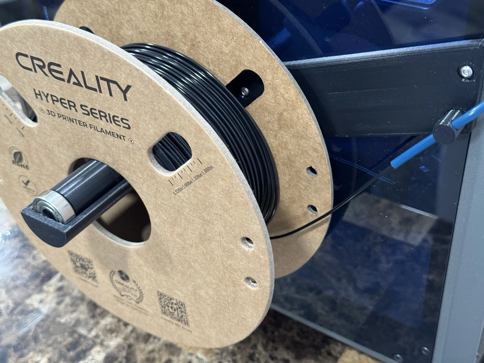 Bộ side mount spool roller cho Creality K1/K1C (không dùng K1 Max), có peg Bowden Printed in Place xoay tự do để tránh kẹp ống. Cần Bowden 165mm, vít M3 và 2 bạc đạn 608ZZ; kèm gợi ý setting in Creality Print.
