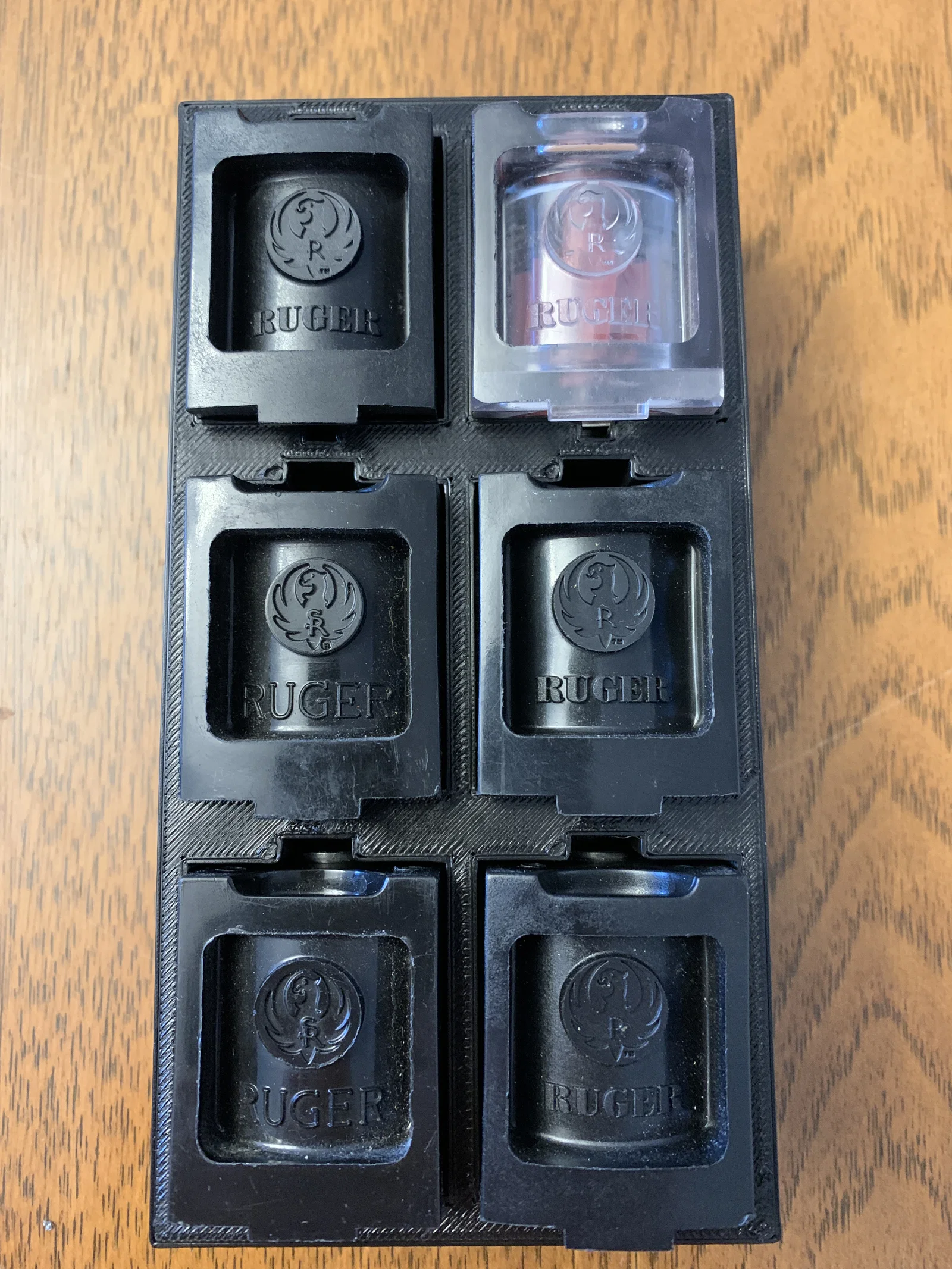 Mẫu in dùng để giữ 6 magazine Ruger 10/22. Thiết kế tính tới 3 biến thể kích thước nên độ khít có thể khác nhau; magazine trong suốt sẽ chặt nhất. Khuyến nghị in 0.3 mm, có thể reslice để giảm layer height.
