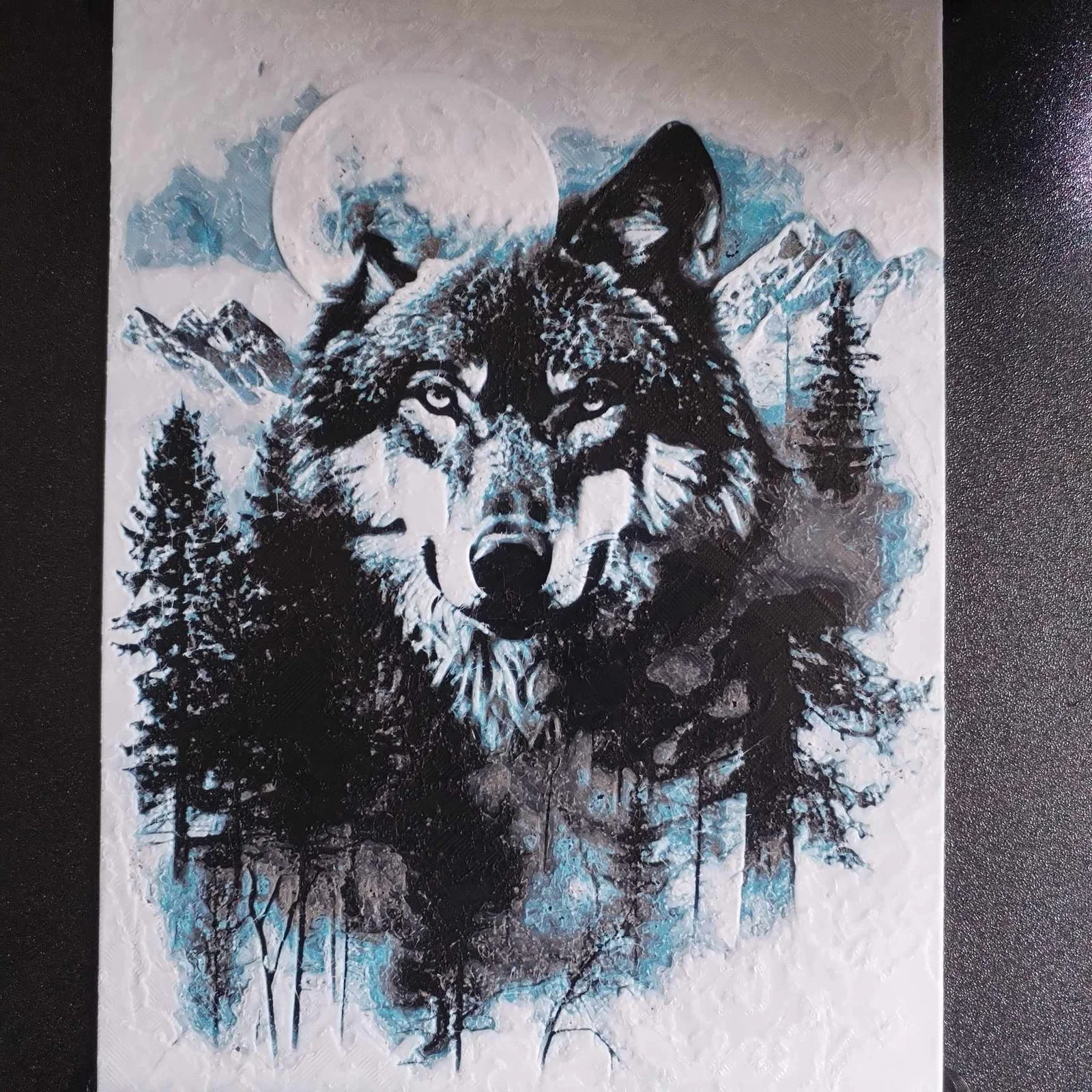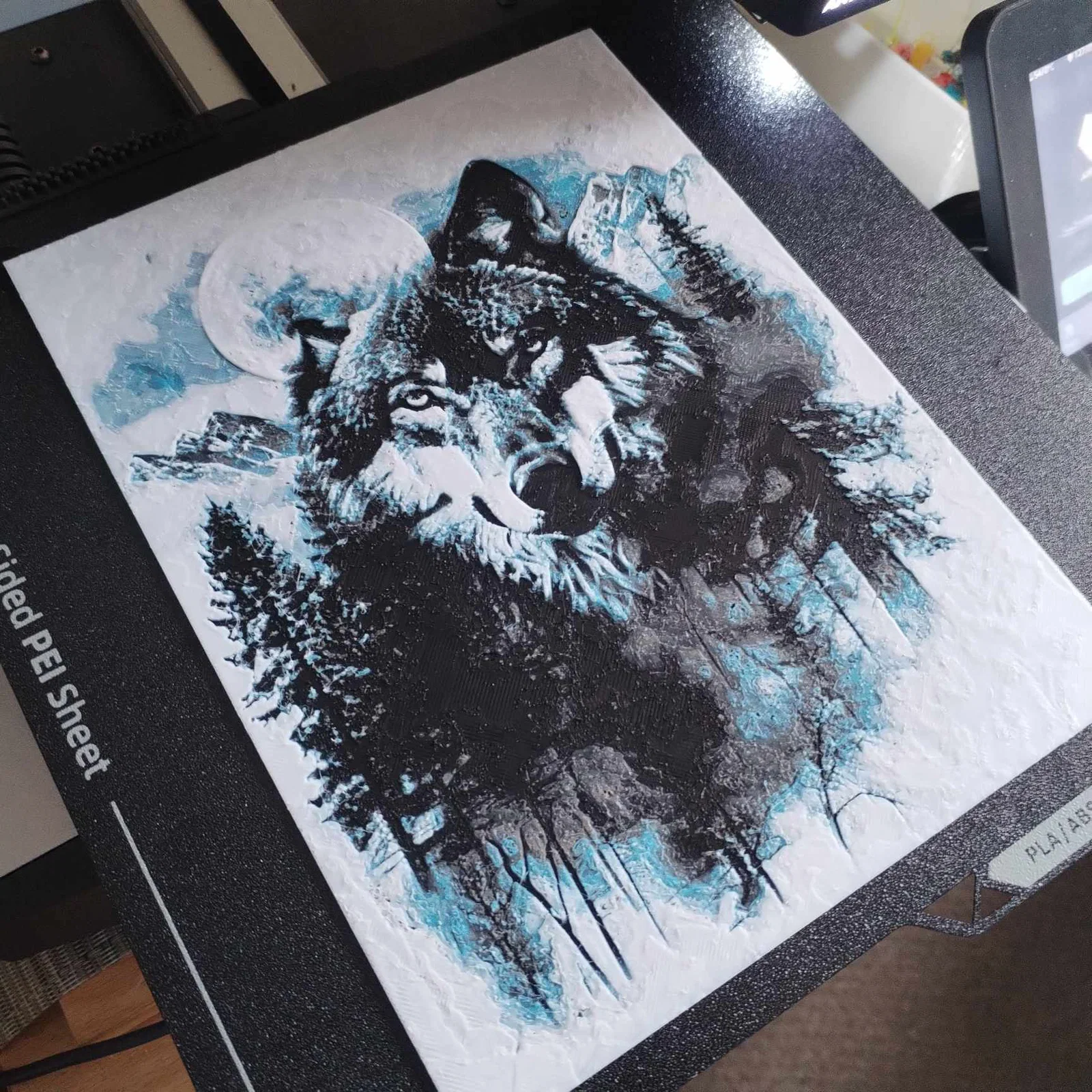 Mẫu wall art Hueforge “Wolf in Forest with Moon” nổi bật, kích thước 173.25x230mm. In 100% infill, layer height 0.08mm (base 0.24mm) và đổi màu theo các mốc layer để ra hiệu ứng ánh trăng đẹp.