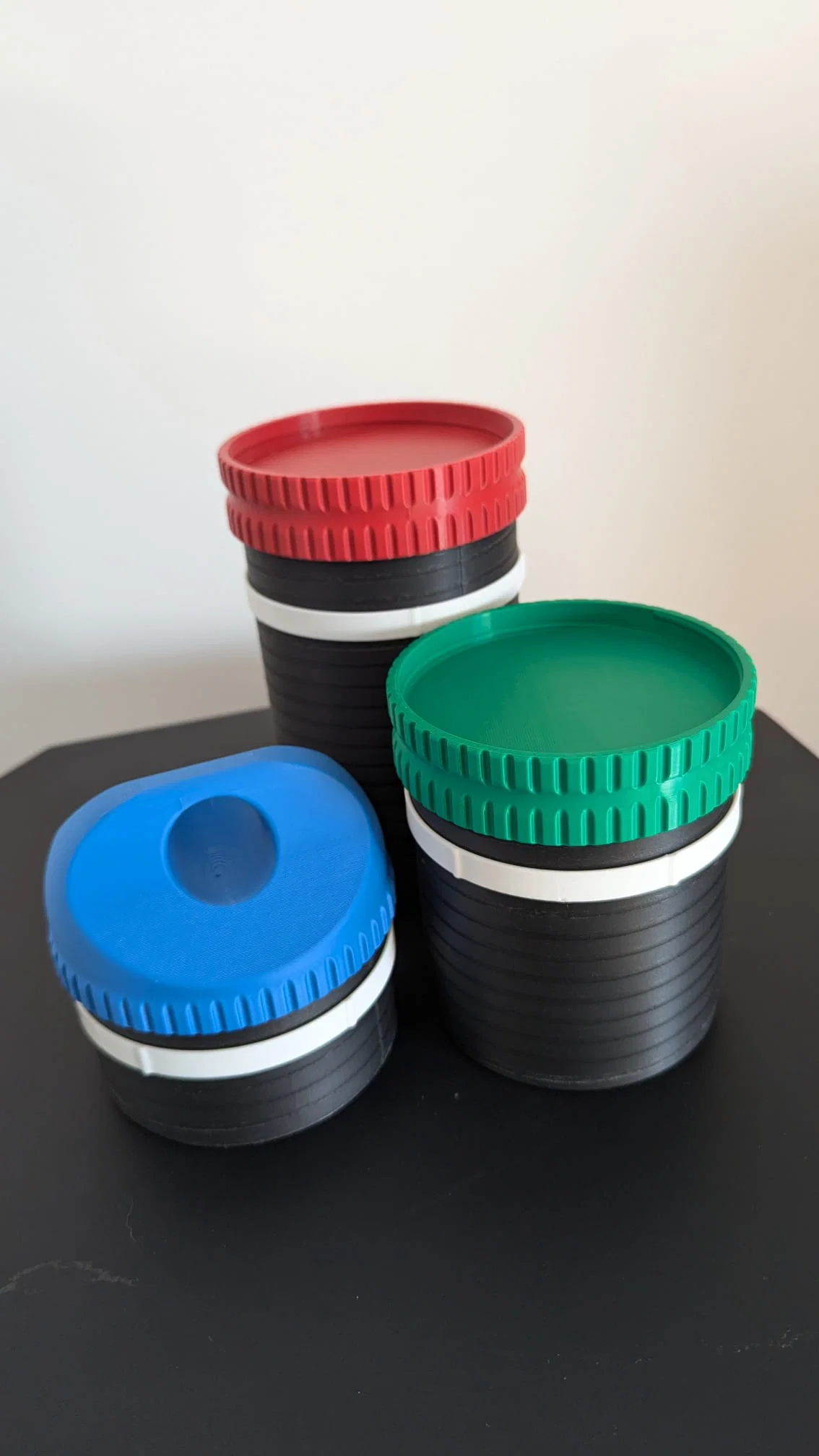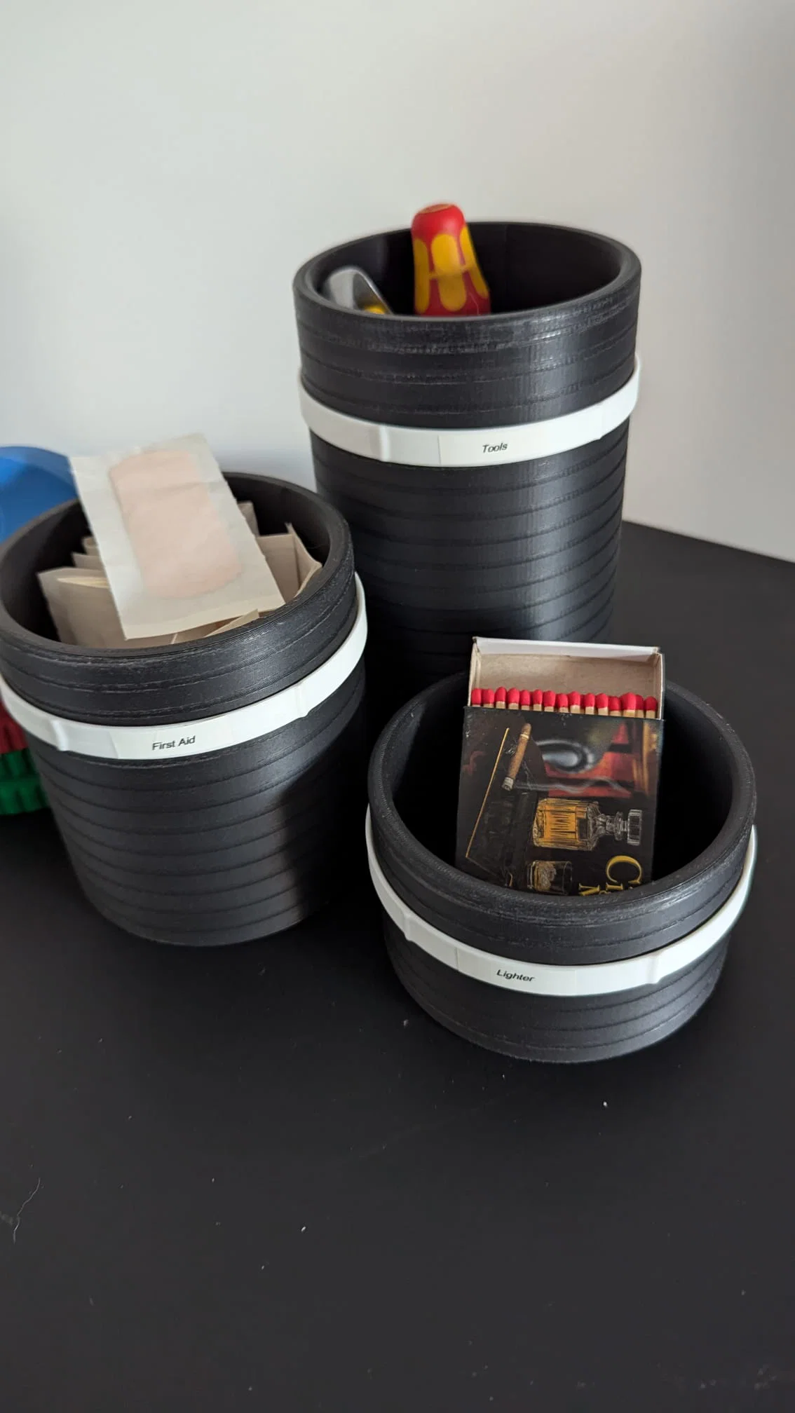 Bộ hộp chứa đồ modular có thể xếp chồng, gồm 3 size dung tích khoảng 300/500/800ml. Lý tưởng cho đi camping để sắp xếp, phân loại các món đồ nhỏ gọn; nắp dễ in với automatic painting support trong PrusaSlicer.
