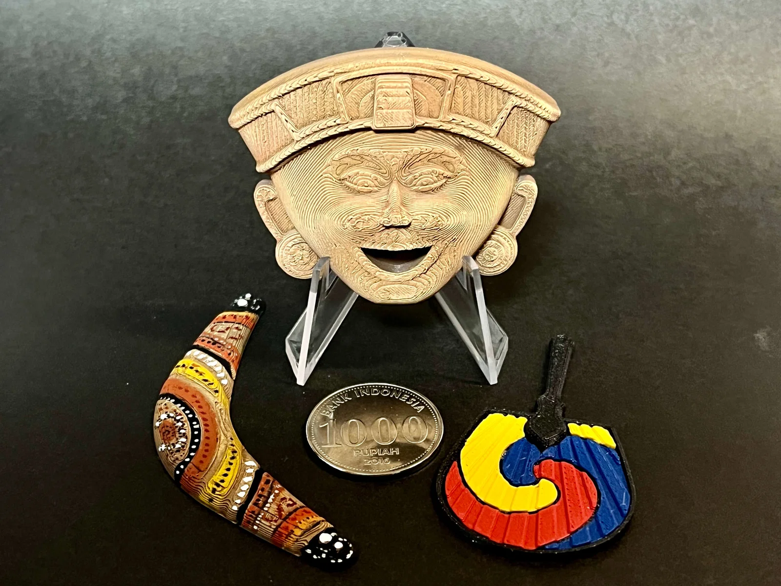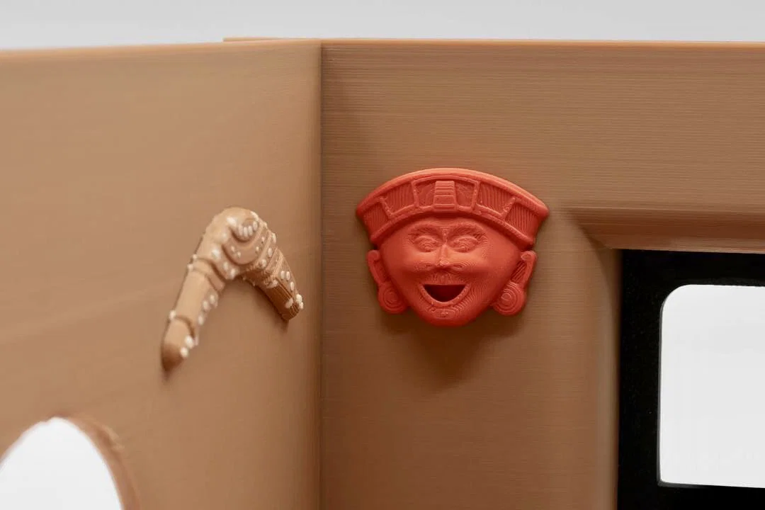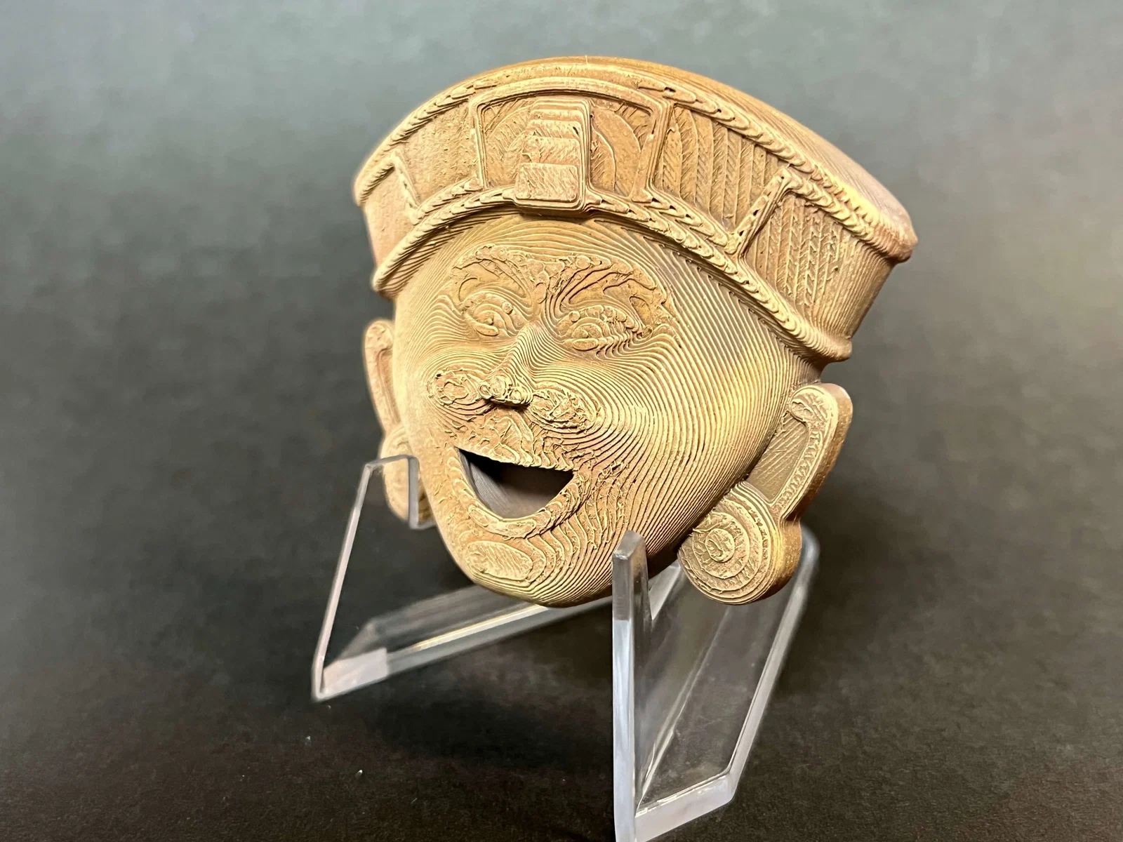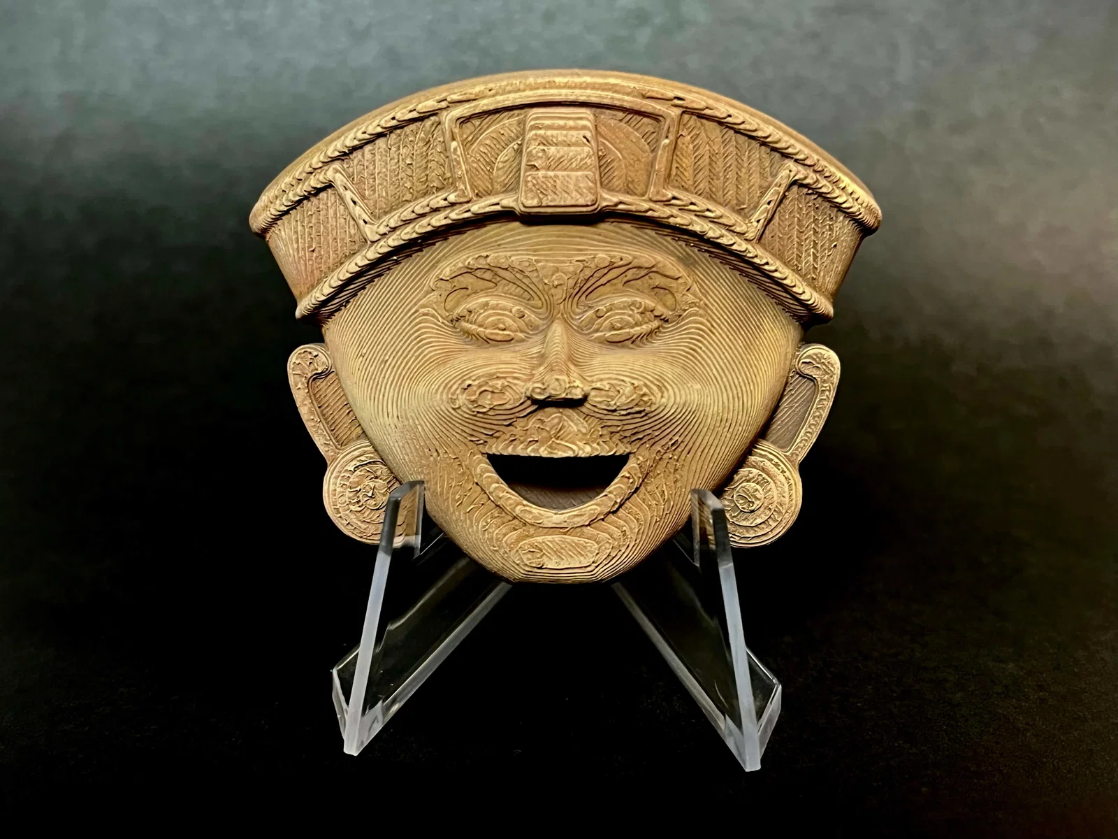 Mô hình mặt nạ đất sét Totonac (Mexico) đại diện cho châu Mỹ trong phòng chủ đề du lịch của dinh thự thu nhỏ. Thiết kế tối ưu để in 3D, in mặt phẳng xuống bed, không cần supports.
