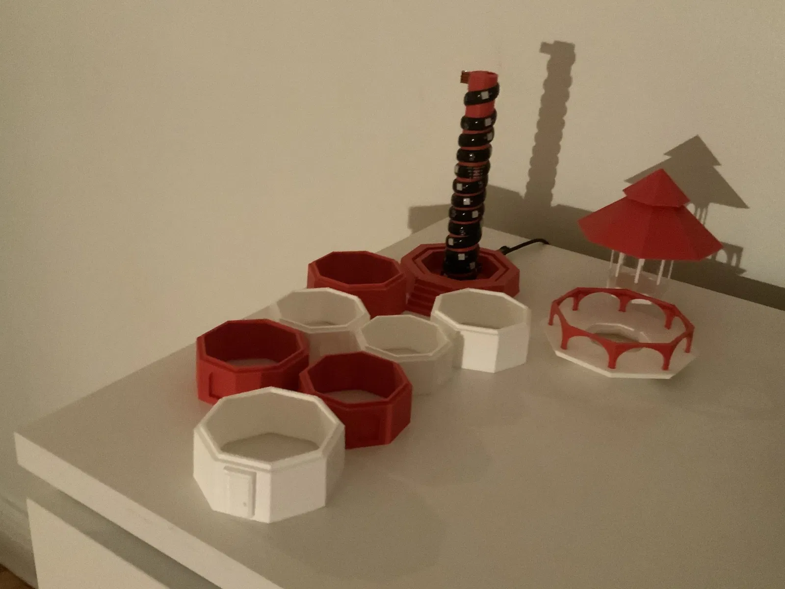 Bạn sẽ cần in phần đế. Sau đó, bạn sẽ có 8 ống để in (2 tường và không cần đổ đầy là rất tốt) để có được tất cả các tầng, nhưng đối với 7 tầng đầu tiên, bạn có thể chọn giữa một phiên bản có cửa sổ trống ("ống" kết thúc bằng v) hoặc một phiên bản với cửa sổ đầy/đục ("ống" kết thúc bằng một số). Ống cuối cùng được gọi là “ống cao”. Trên đó sẽ là lan can và phần trên, sau đó là mái.