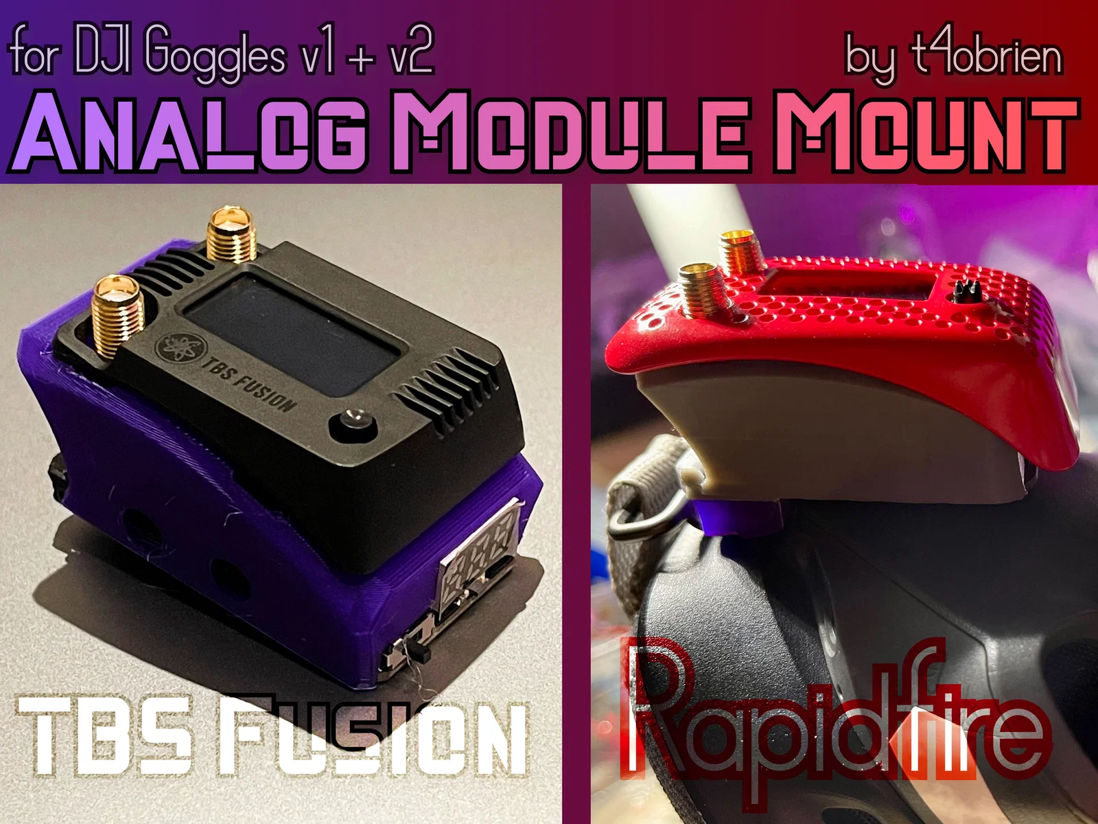 Khay gắn analog module dạng modular quick release cho DJI FPV Goggles, dùng với V2 Adapter Board và V3 adapter PCB. Tương thích module chuẩn FatShark như RapidFire, TBS Fusion… In tốt với PLA/PET-G/HT-PLA+.