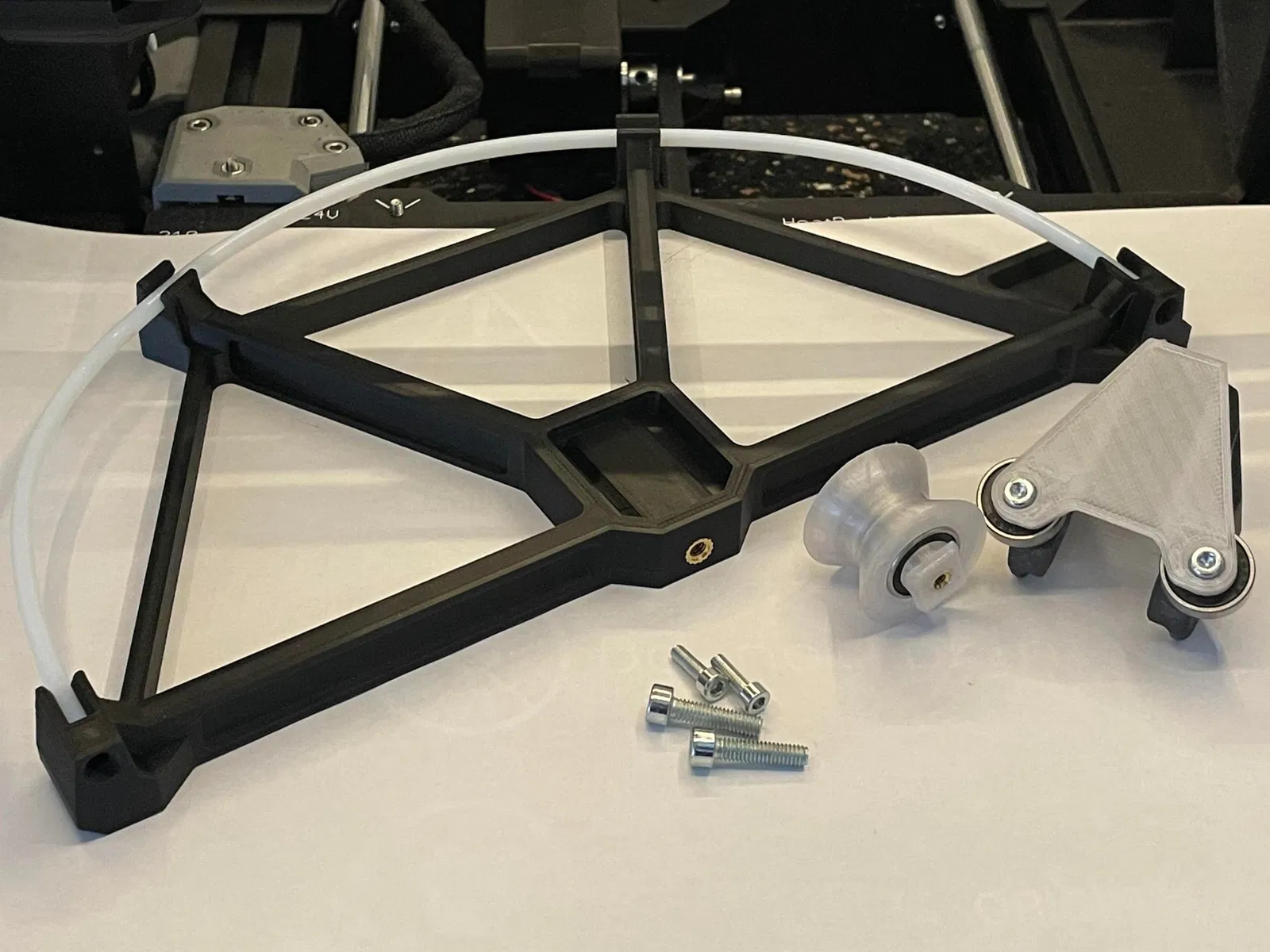Cơ bản, đây chỉ là một bộ dẫn filament sử dụng ống PTFE. Tuy nhiên, để đạt được bố cục thấp, nó sử dụng một bánh xe idler để hỗ trợ việc cấp filament mượt mà. Theo kinh nghiệm của tôi, hầu hết thời gian filament chạy trên bánh xe idler chính nhưng trong một số trường hợp, các con lăn bên (2x ổ bi 688) được sử dụng.