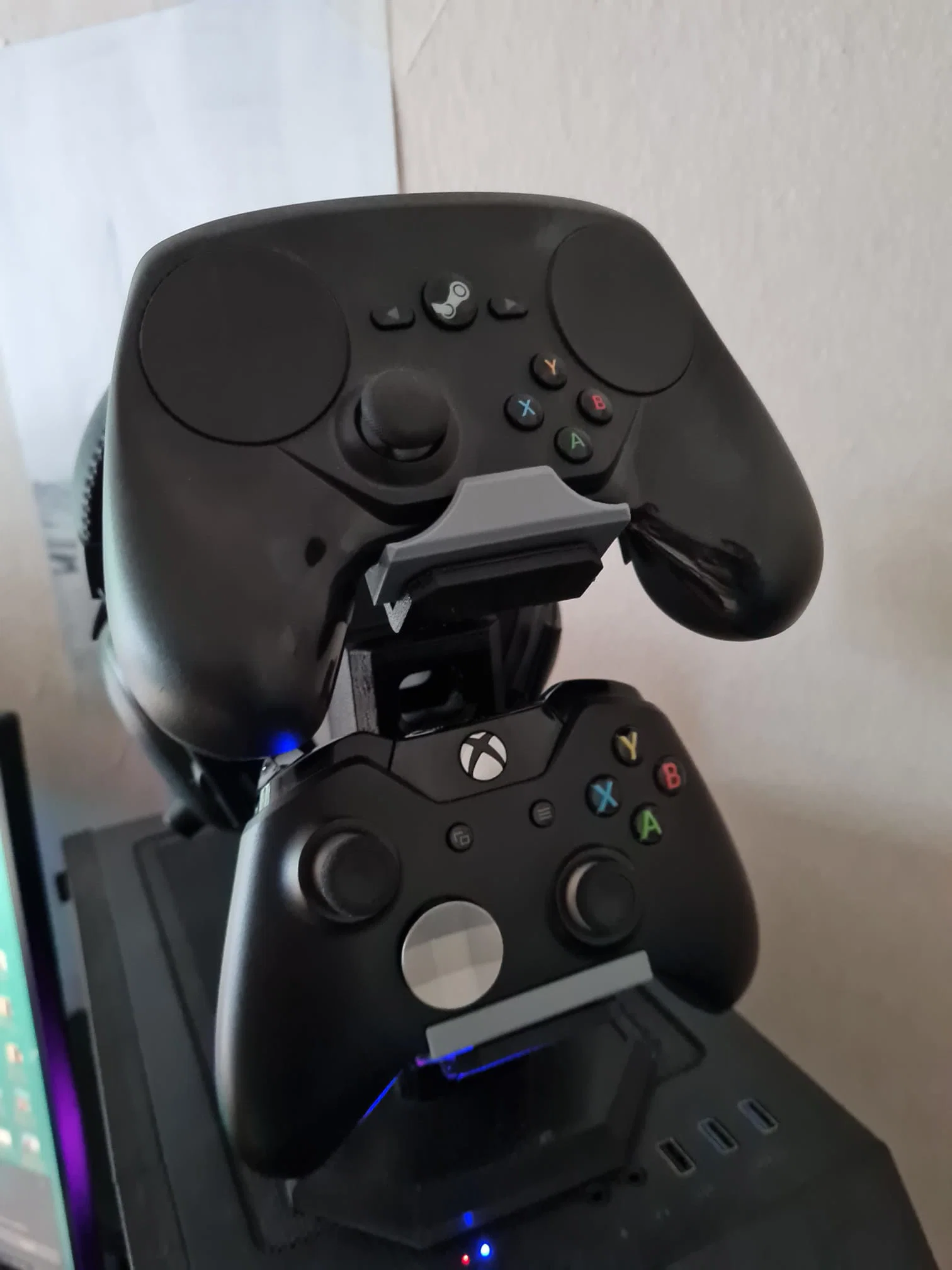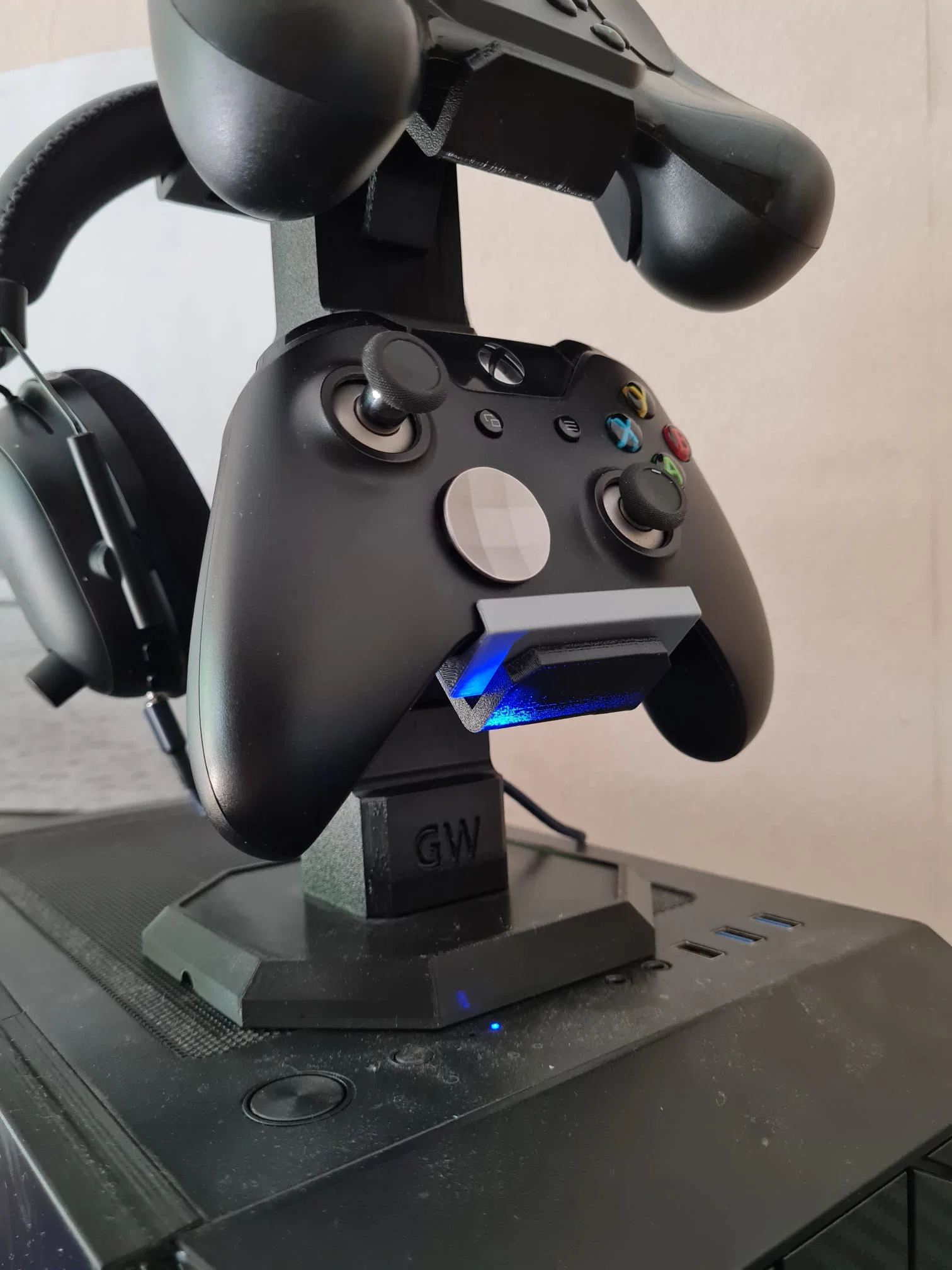 Mình hay xài tay cầm Xbox One và gặp vấn đề với tháp treo tay cầm & tai nghe của Guillermo Wismann. Nếu đặt tay cầm Xbox ngay ngắn ở giữa phần tay đỡ của tháp thì giữ cũng ổn, nhưng khi bị rung (ví dụ mình lỡ va vào bàn) thì đôi lúc nó bị xê dịch; tới lúc trượt về một bên của tay cầm là nó rớt cái “rụp” khỏi tháp và rơi xuống đất. Nó làm vậy gần 10 lần rồi, mình không muốn tay cầm bị hư nên mình thiết kế nhanh mấy cái adapter này! Mình cũng có một tay cầm PS4, mình thử trên tháp thì thấy còn giữ tệ hơn nữa, nên mình cũng thiết kế thêm adapter cho nó.