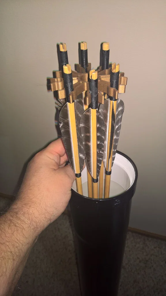 Đây là bản mình thử làm một cái kẹp mũi tên để giữ 8 mũi trong ống PVC thành mỏng 4". Ý tưởng là dùng hai cái để giữ cho phần lông (fletching) không bị móp hay hư.