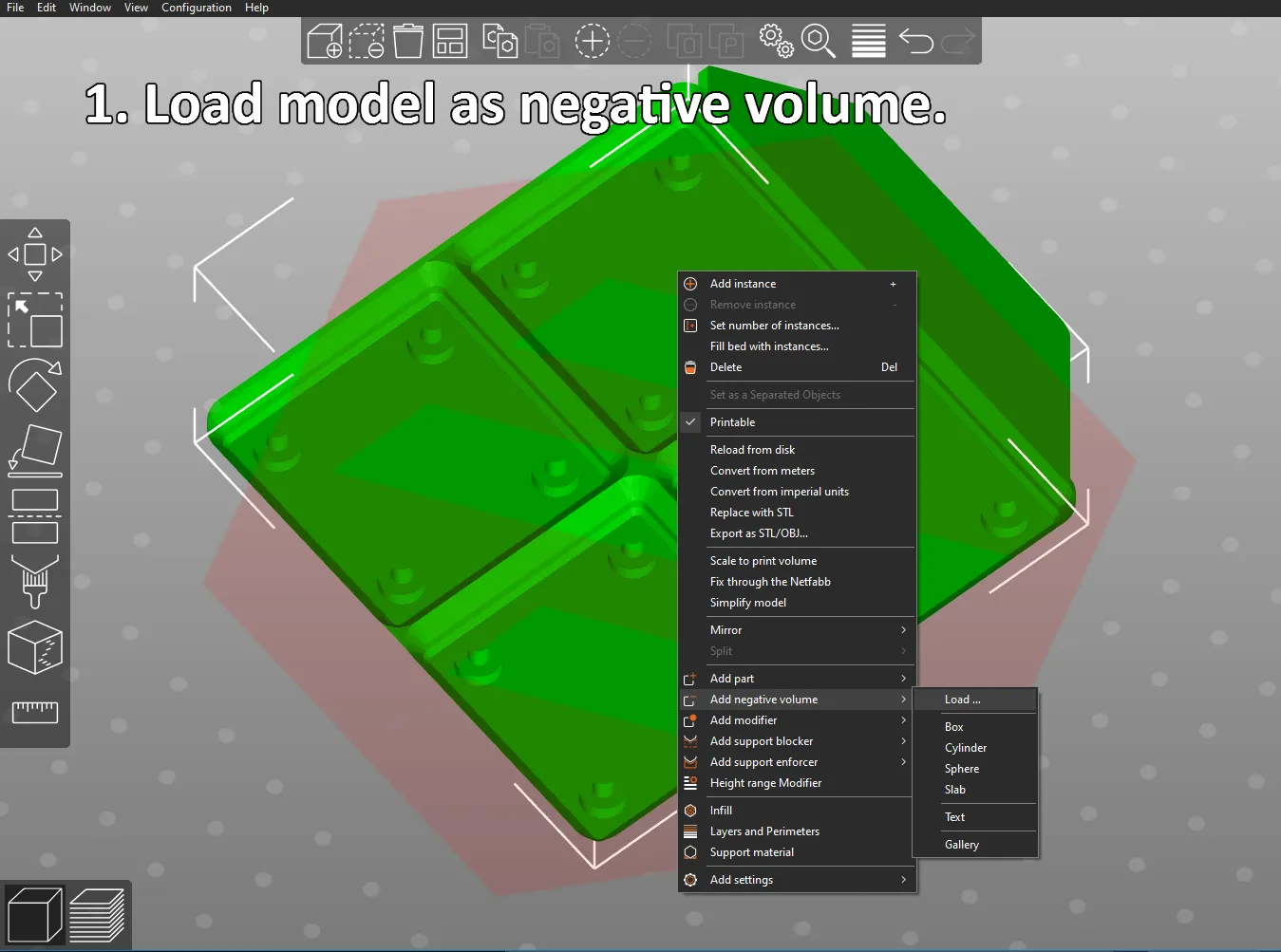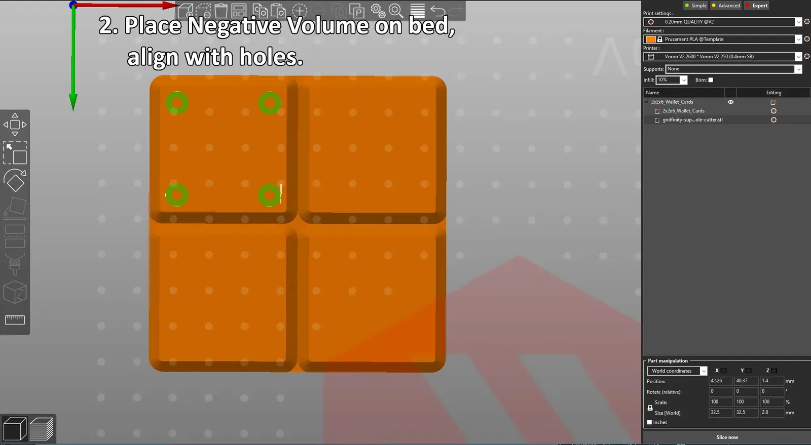 - LƯU Ý: Một số bộ phận Gridfinity có lỗ nam châm được đặt sâu hơn một chút so với mô hình tiêu chuẩn. Nâng thể tích âm lên một chiều cao lớp và thử lại, lặp lại cho đến khi nó hoạt động.