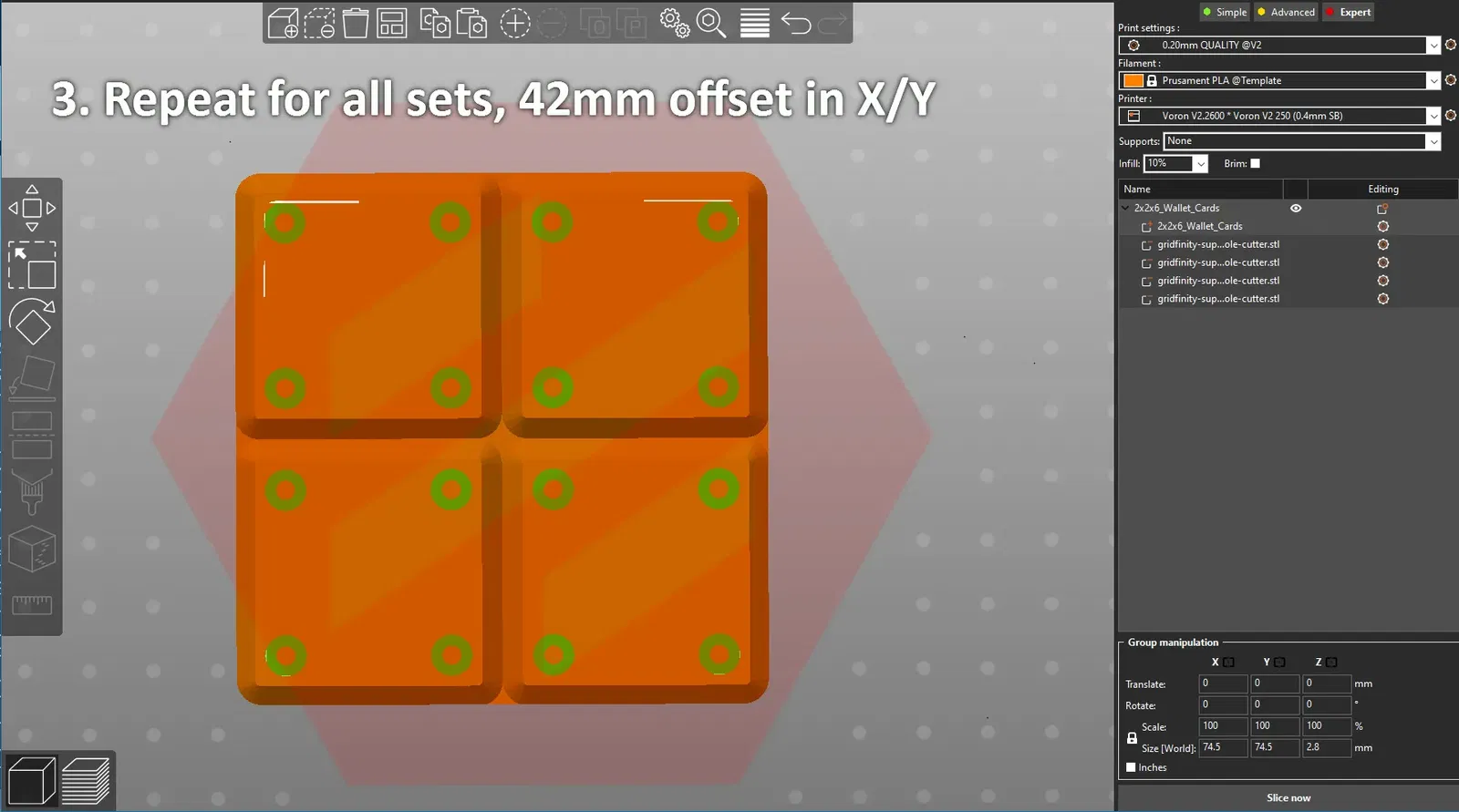 - Lặp lại cho mỗi bộ lỗ, cách nhau theo bội số của 42mm ở trục X và/hoặc Y.