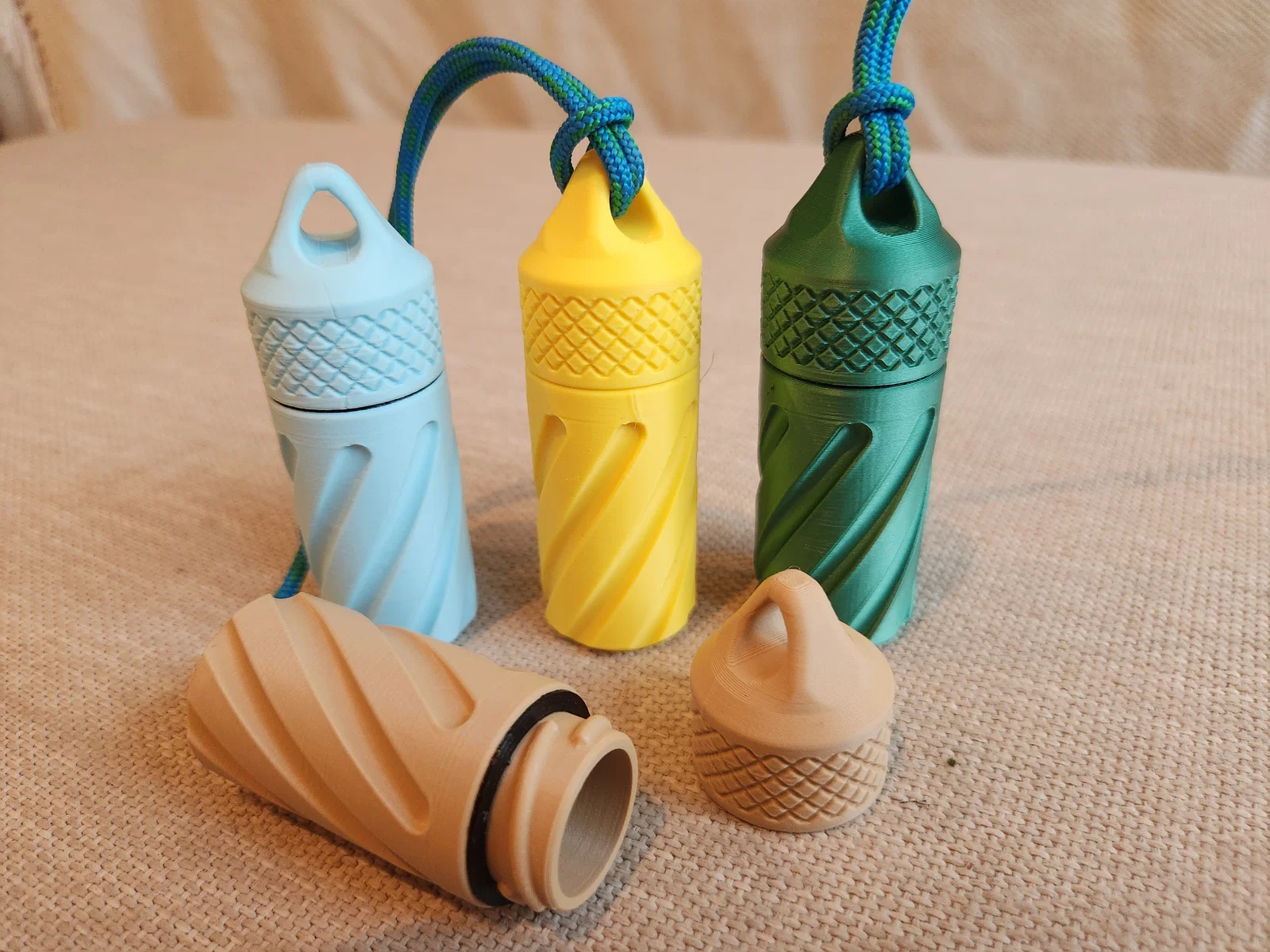 Capsule nhỏ dạng nắp vặn để làm hộp EDC, đựng diêm, thuốc, pin và đồ lặt vặt. Có vòng treo để móc balo/xe. In không cần supports; kèm gasket tùy chọn in TPU giúp kín nước (watertight).