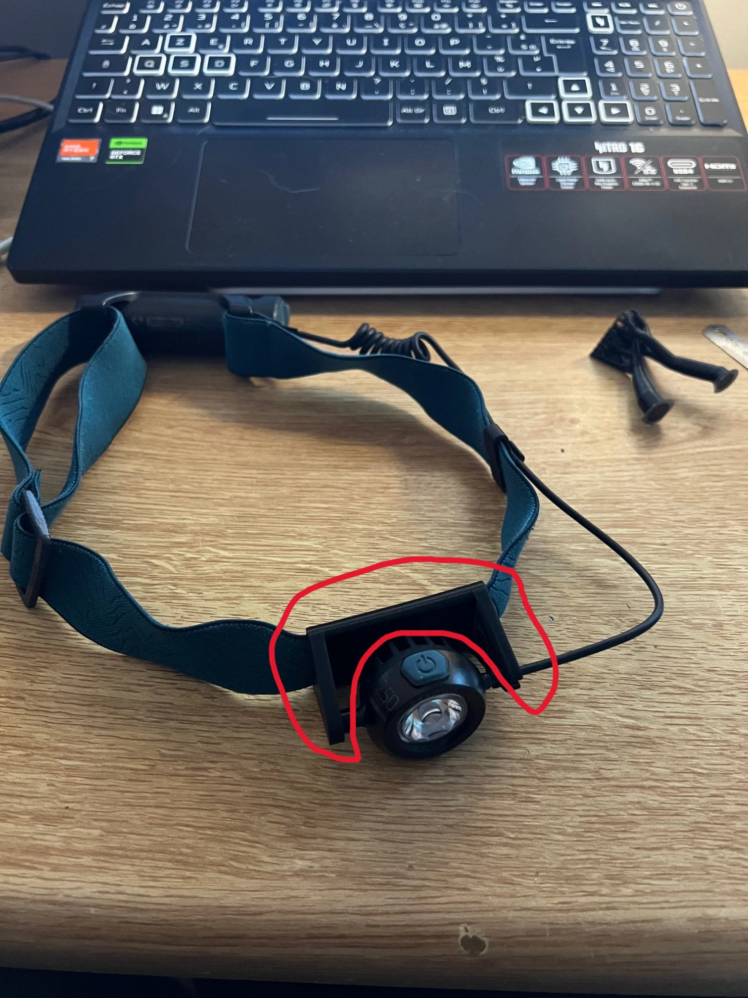 Phụ tùng thay thế cho đèn đội đầu Decathlon Evadict 250, đây là phần dùng để nối cụm đèn với dây băng thun. In 3D theo hướng dựng đứng, với phần khoét rỗng ở phía trên. Đã test và dùng ổn.