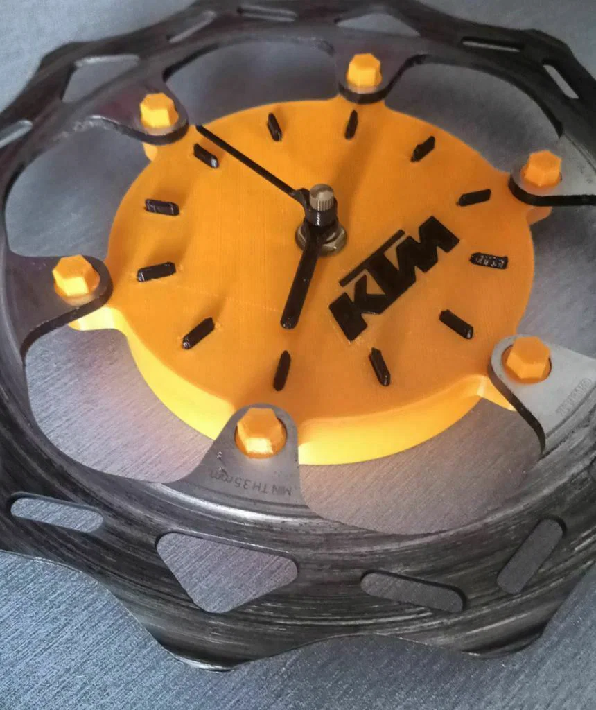 Mẫu đồng hồ treo tường cho gara, lấy cảm hứng từ đĩa phanh xe KTM TPI 300. Phù hợp lắp bộ máy đồng hồ kích thước 57 x 57 x 17.5 mm; kèm link mua bộ máy để bạn tham khảo.
