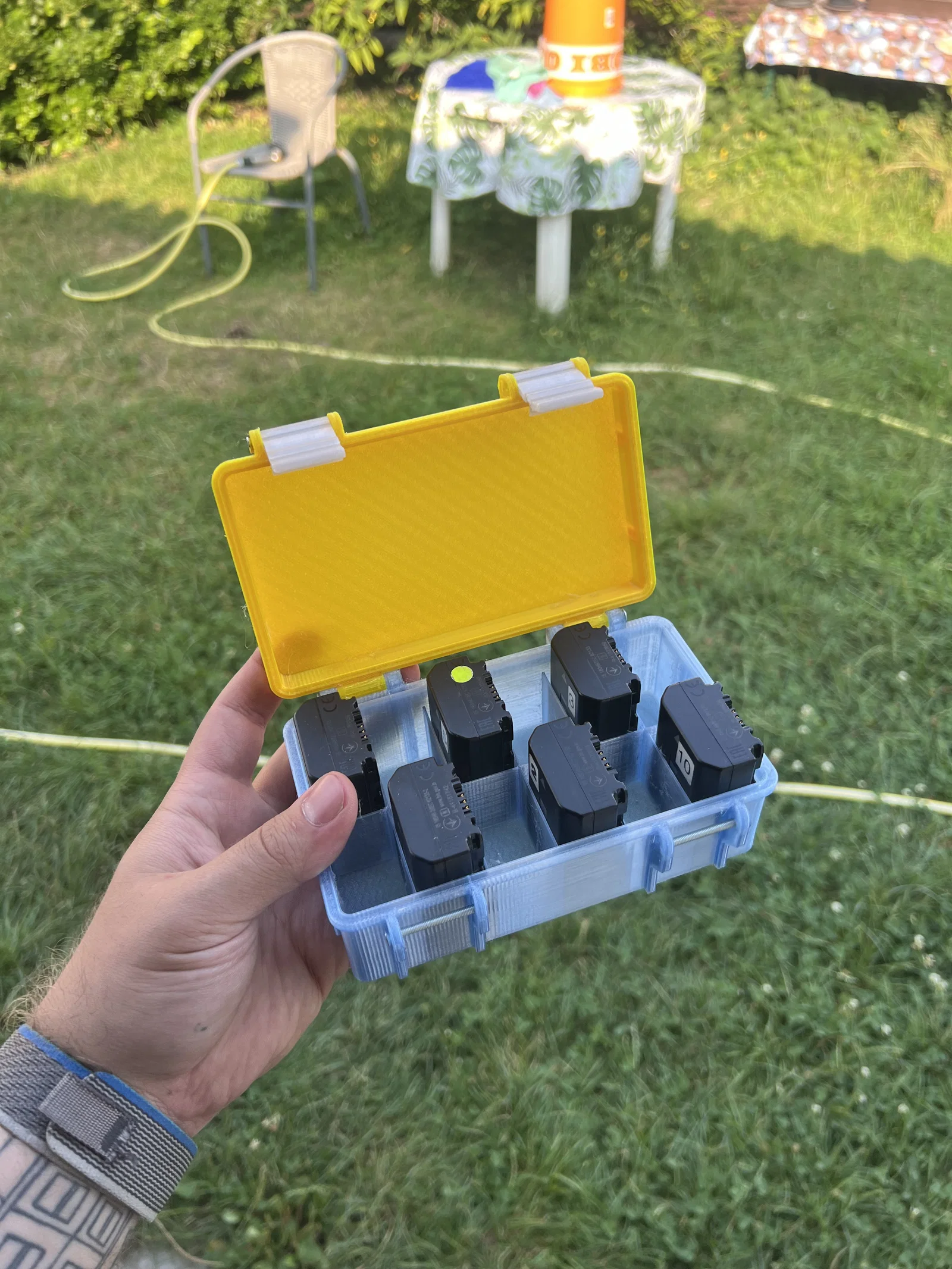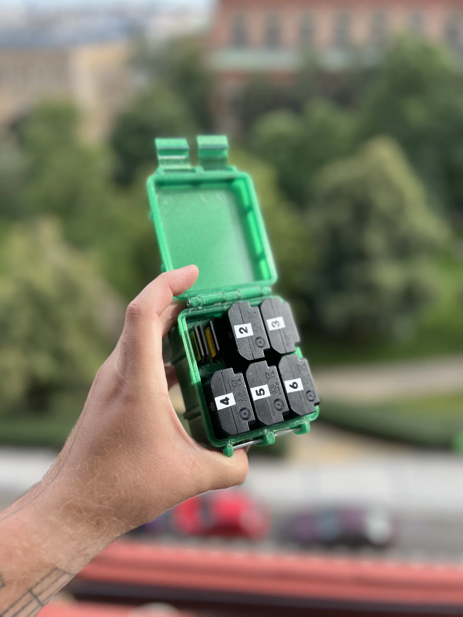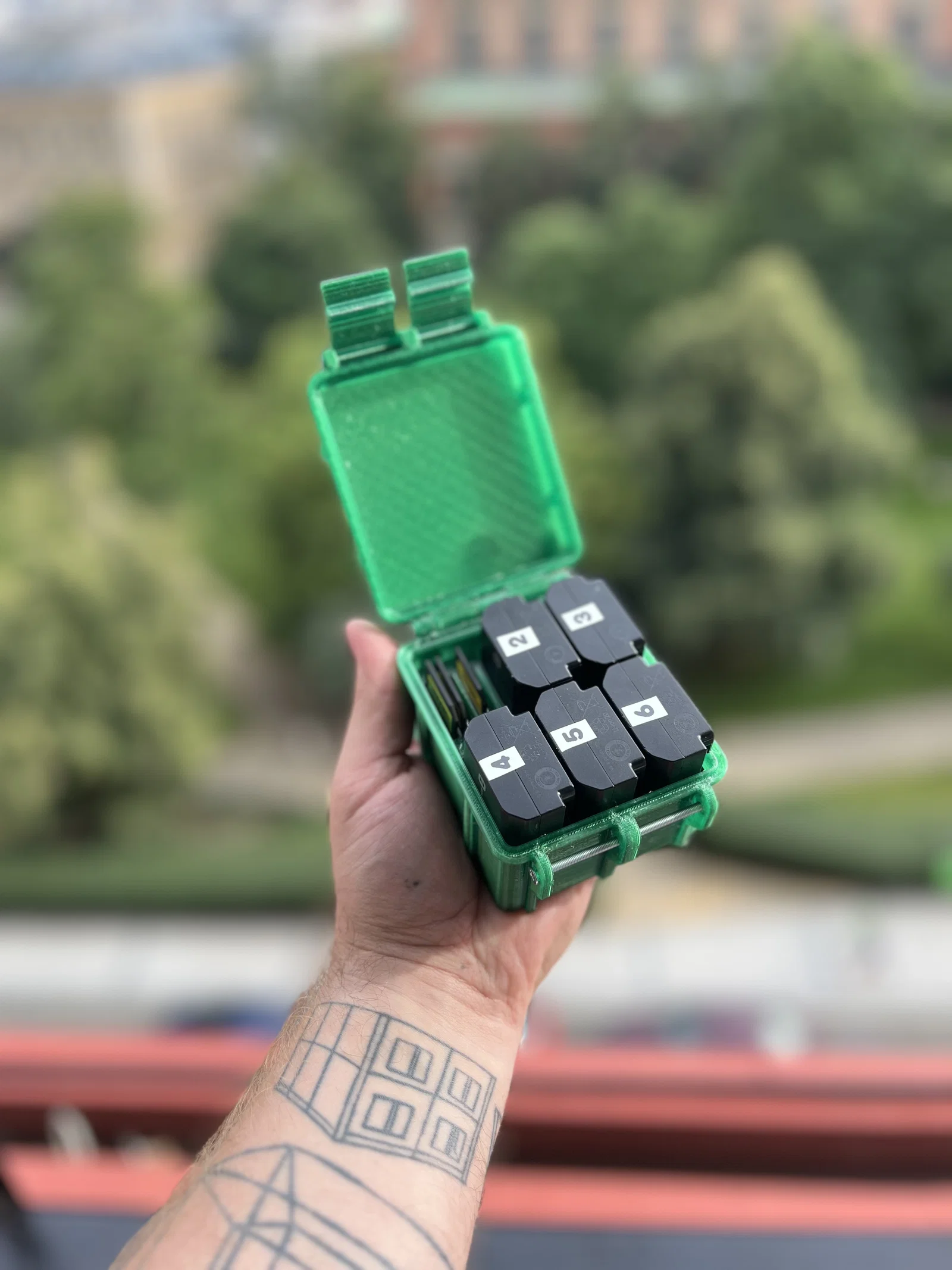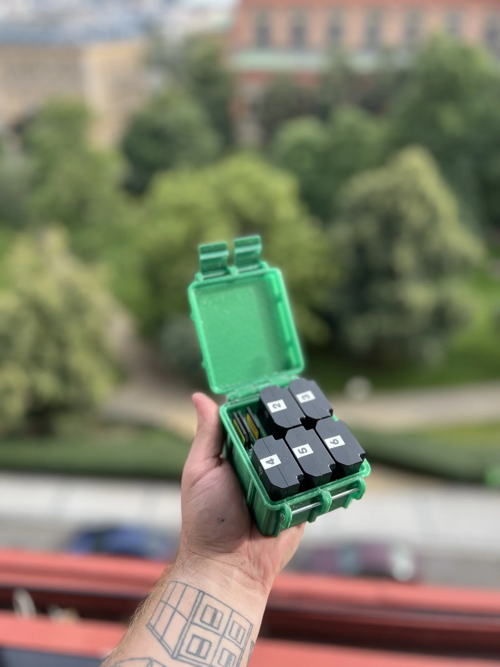 Hộp đựng pin Sony NP-FZ100 cho dòng Sony Alpha, có bản 6 viên và 12 viên. Gồm nắp, đáy và latch; có adapter SD/CfA. Khuyến nghị 3 perimeter, infill 20%, nên in PETG cho latch; dùng vít M3x30.