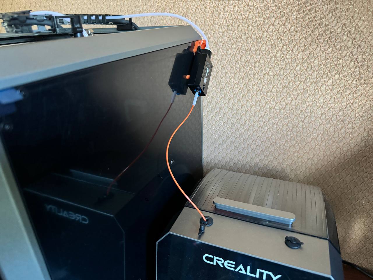 Giá đỡ filament sensor nhẹ cho Creality K1C, lắp bên phải máy. Thiết kế ít nhựa nhưng vẫn chắc chắn, có phần đỡ filament tube để tránh cọ vào thân máy. Lắp bằng 2 vít M3x8 và gỡ dây khỏi zip tie.
