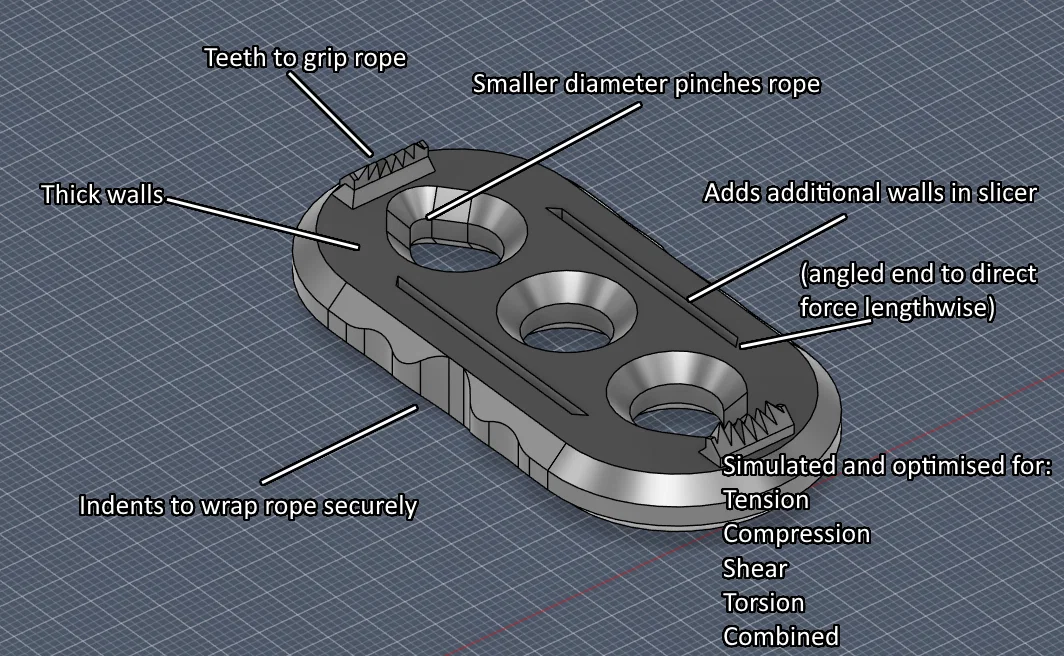 Mẫu rope tensioner “The only rope tensioner you will ever need” được thiết kế để khắc phục lỗi các mẫu khác: không có điểm chịu ứng suất cao, tối ưu kẹp dây. Có nhiều size lỗ (XS–L), tuỳ chọn có/không Teeth và file .step để remix.