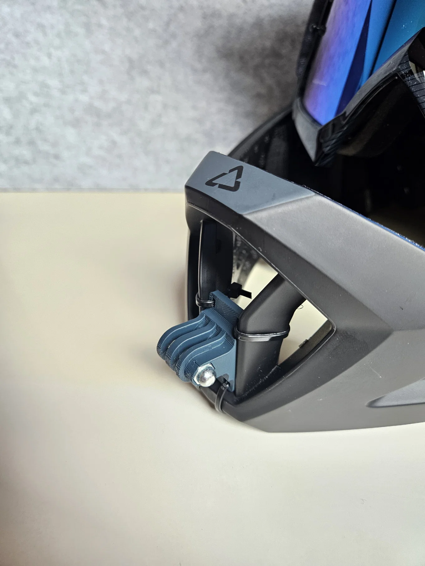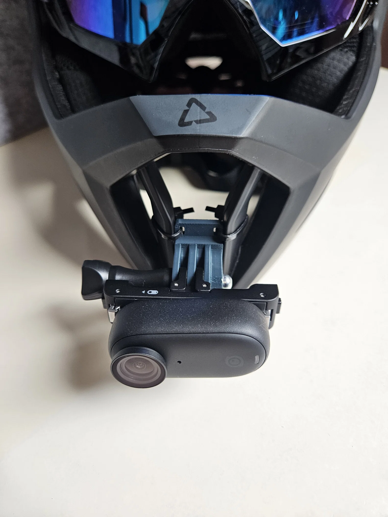 Ngàm gắn cằm (chin mount) dạng ngang cho action camera, lắp lên mouthguard của Leatt Enduro 4.0. V2 cho biên độ xoay 180° và hỗ trợ gắn GoPro. In 0.2mm, 6 walls, 20% infill; khuyên PETG/ABS.