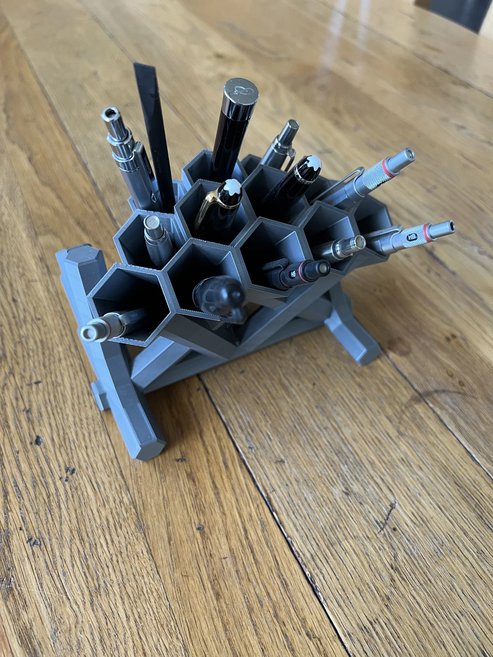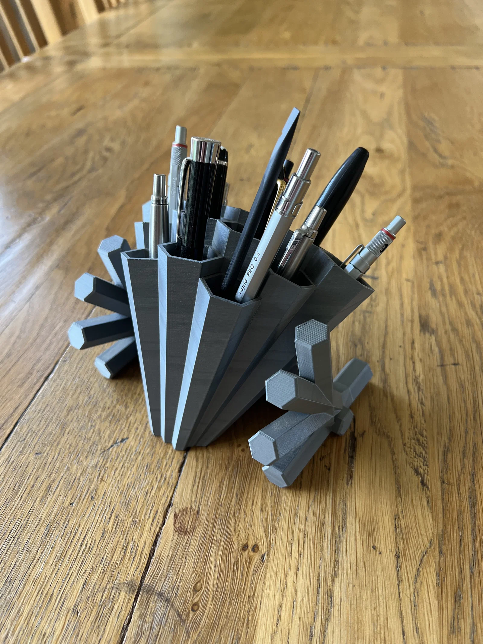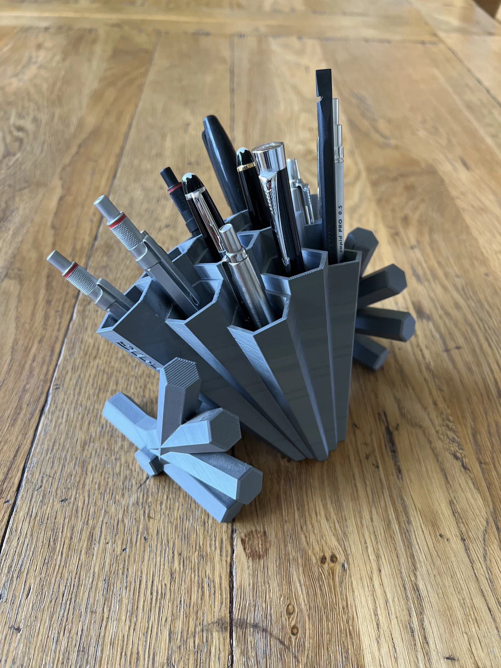 Ống cắm bút phong cách hình học độc đáo, được thiết kế lại từ mẫu gốc để có vẻ ngoài tinh tế hơn. Sản phẩm có thể in 3D dễ dàng mà không cần dùng support, phù hợp để decor bàn làm việc gọn gàng.