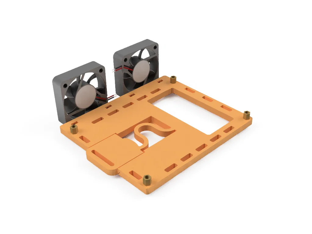 Mẫu gá DIN rail cho BIGTREETECH SKR 1.4, dùng 2 quạt 40mm (4040 fan) để thổi làm mát, phù hợp DIN rail 35mm. Kèm link linh kiện lắp ráp như vít M3, đai ốc M3 và trụ cách.