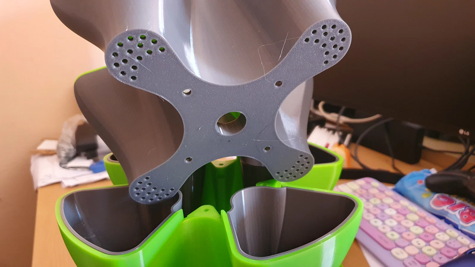 - với nắp trên: lắp 4 cái giỏ lần lượt từng cái một (kiểu press fit), sau đó luồn ống vào, cuối cùng gắn vào module trên cùng