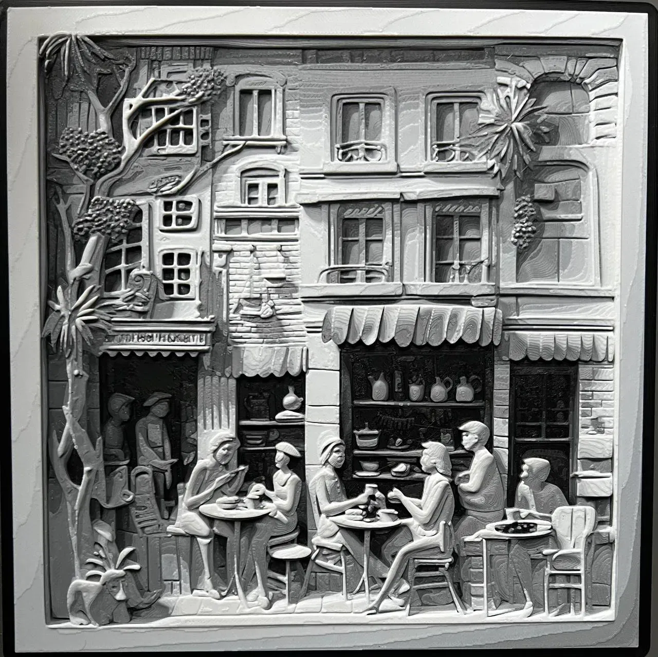 Bức tranh filament mô tả một quán cà phê đô thị và những người đang thưởng thức cà phê của họ.
