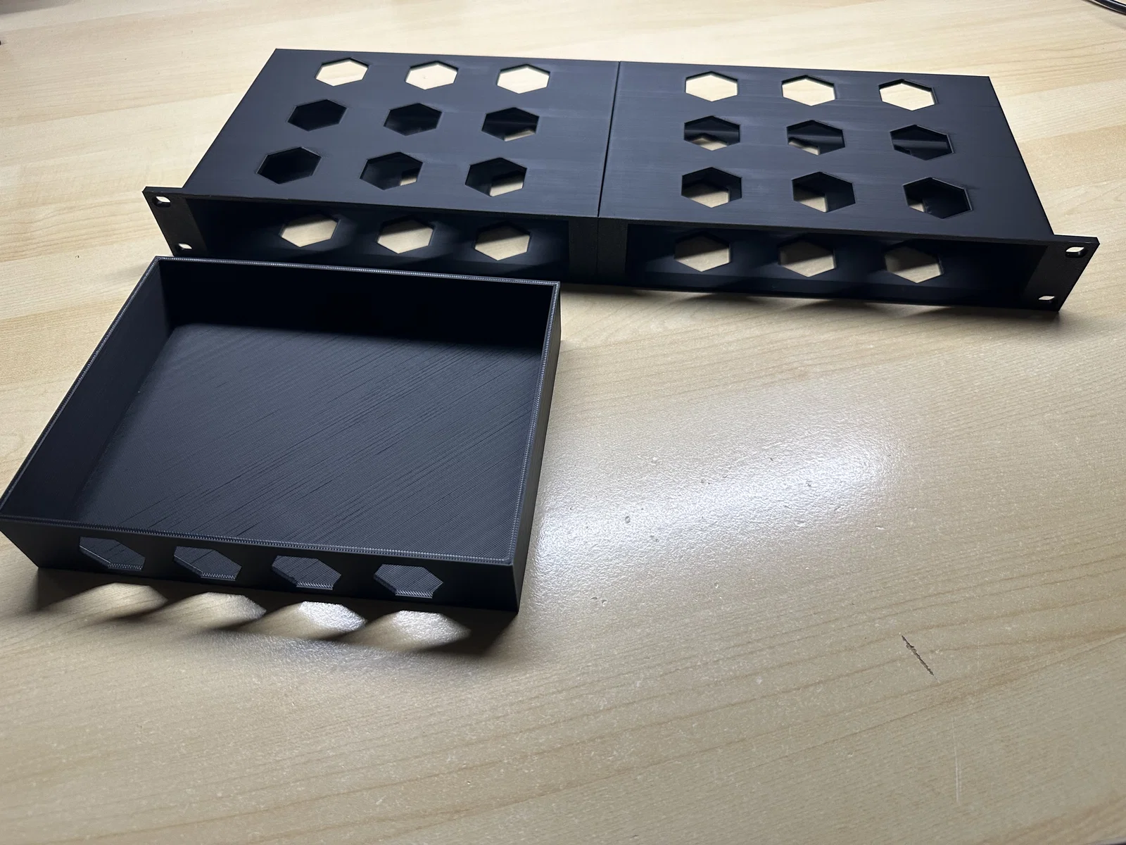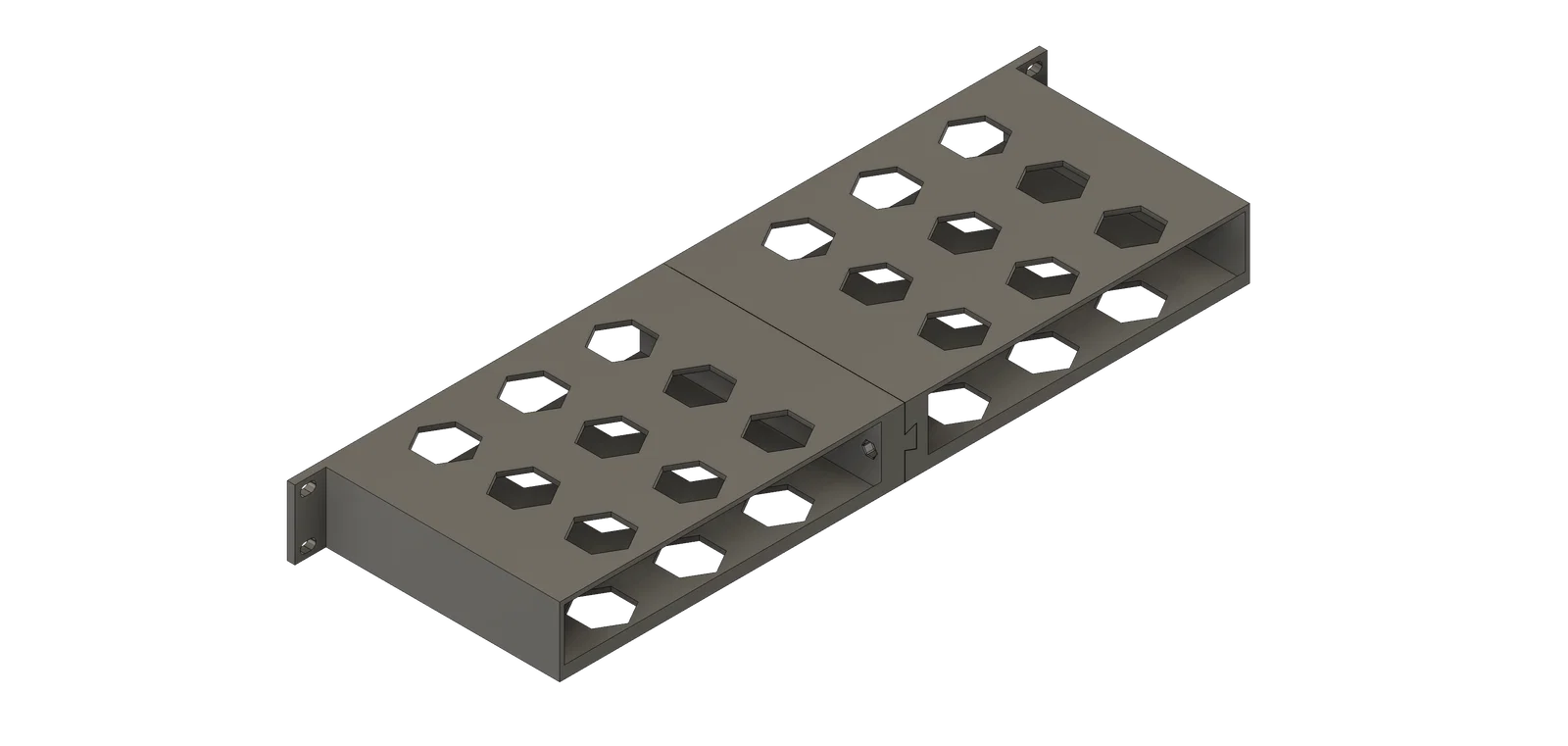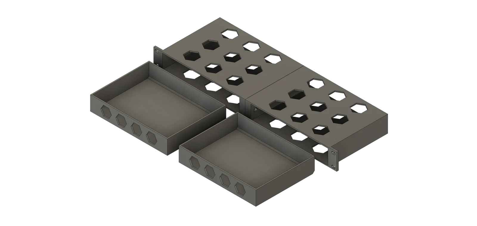 Mẫu giá đỡ rack 19" dạng rackmount cao 1U, đi kèm 2 ngăn kéo tiện dụng. Cần 2 vít M4x25 + đai ốc M4 và 4 vít lắp rack. Khuyến nghị in PLA, mặt trước dựng đứng, ngăn kéo in đáy.