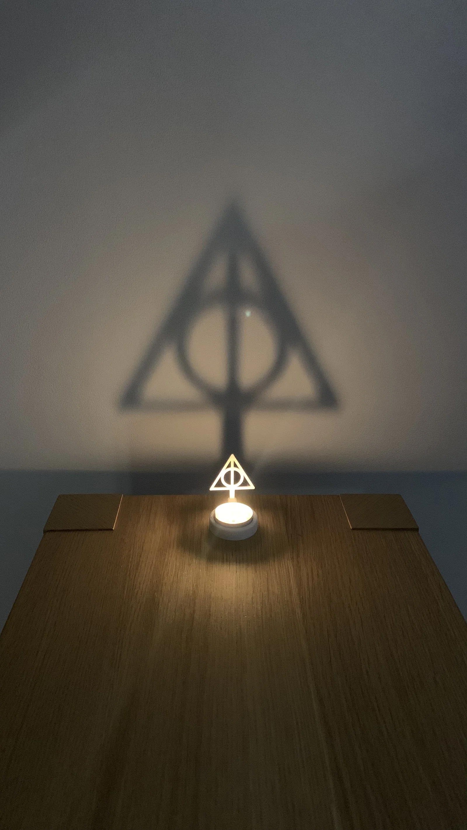 Đế nến tealight chủ đề Harry Potter – Deathly Hallows, đặt vừa nến tiêu chuẩn và tạo hiệu ứng bóng đổ đẹp trên tường. In rất dễ, không cần supports. Lưu ý an toàn vì dùng lửa hở.