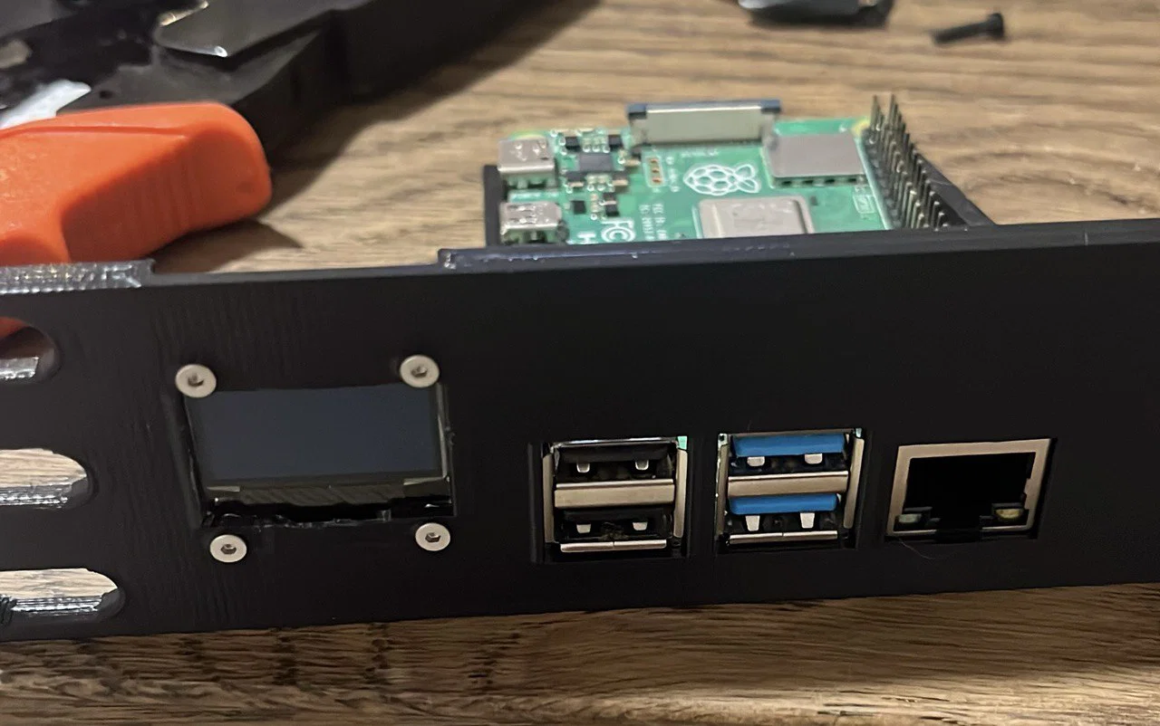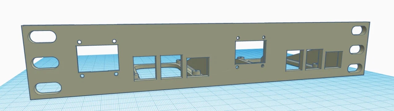 Ngàm gắn rack 10-inch cho hai Raspberry Pi 4 model B. Mẫu này có 2 phiên bản: một bản có khoét lỗ cho OLED và một bản không có.