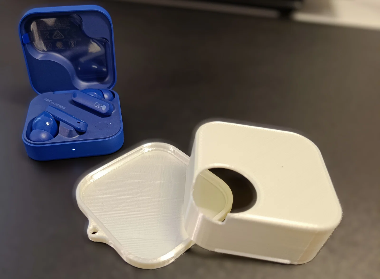 Hộp đựng CMF Buds Pro 2 đơn giản, in PLA (có thể đổi vật liệu). Thân và nắp gài snap chắc chắn, có vòng gắn keychain, lỗ xem đèn LED, chừa cổng USB để sạc, và lỗ trên đỉnh để dùng vòng nhôm.