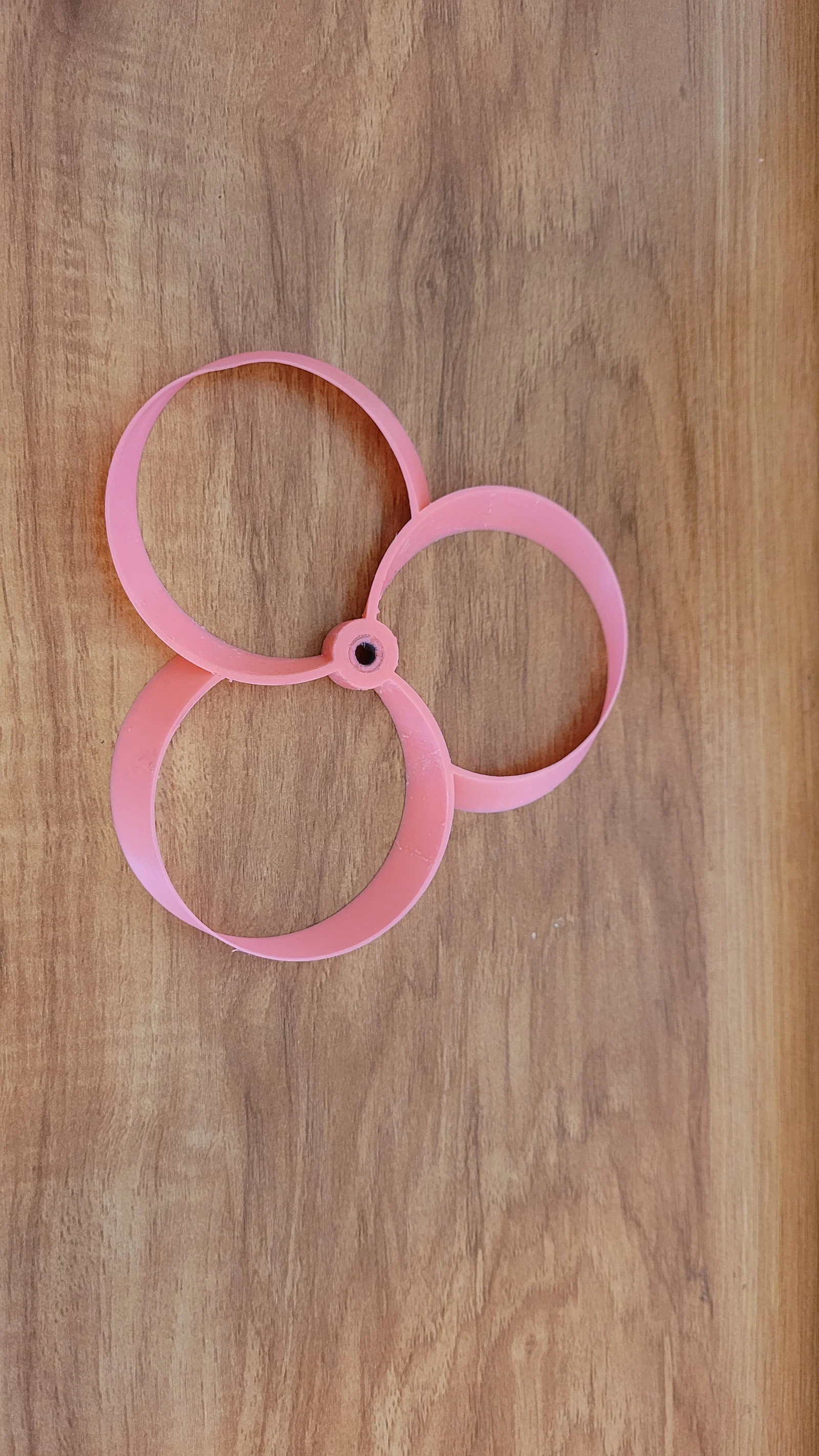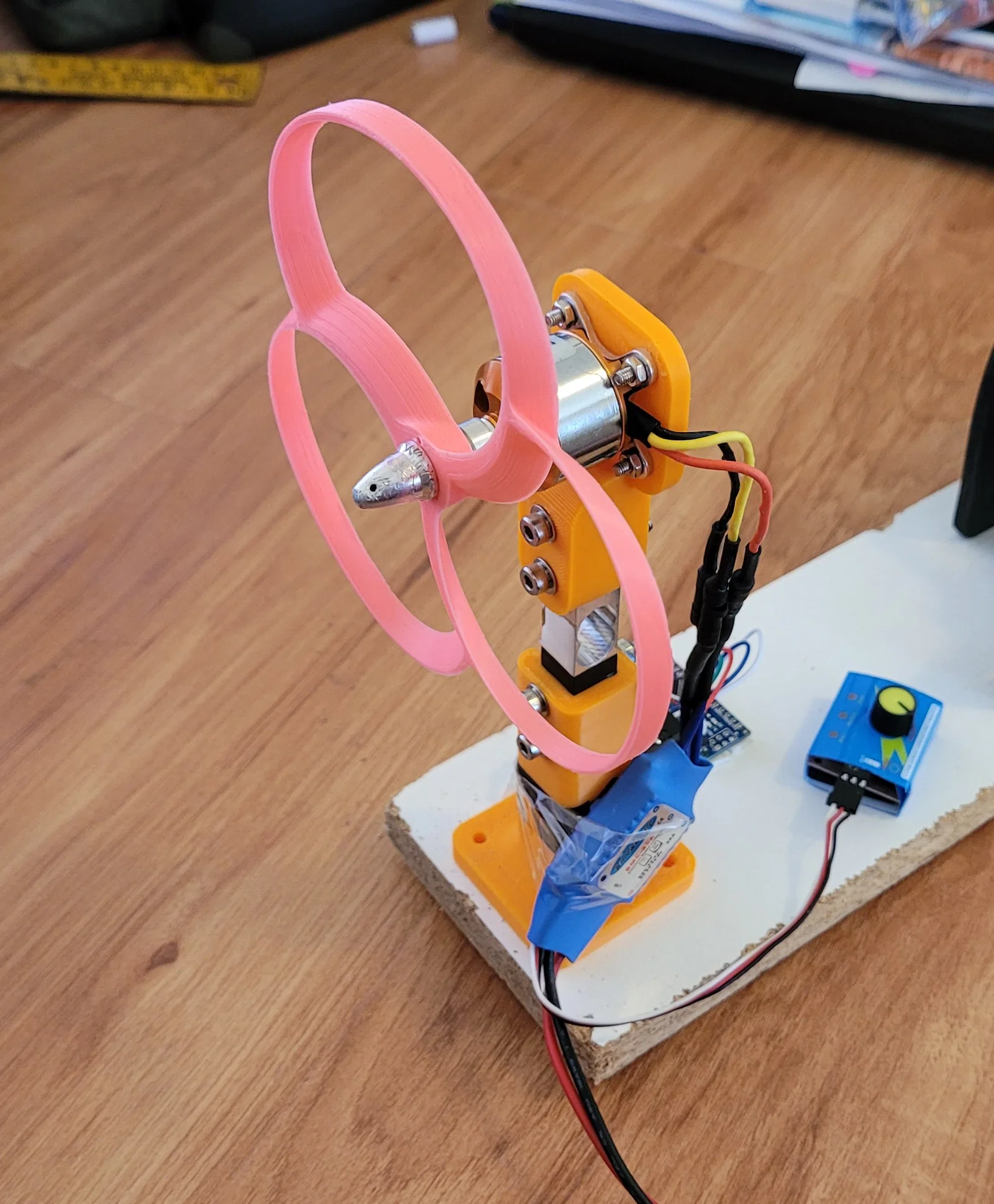Bản thử nghiệm đầu tiên của cánh quạt toroidal 3 vòng 140mm cho RC plane nhẹ, lấy cảm hứng từ MIT. Dùng trục 4mm, chạy 2S LiPo với motor 2212 2200KV cho khoảng 700g thrust; lưu ý an toàn vì cánh có thể giãn ở tua cao.
