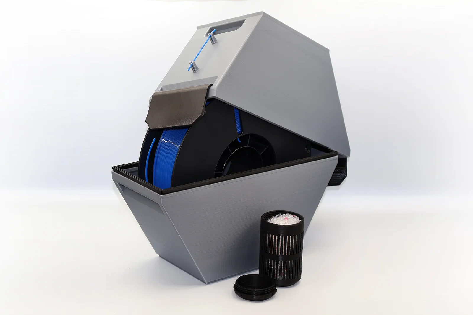 Hầu hết filament nhựa nên được bảo quản trong môi trường khô để tránh hút ẩm. Với Dry Box này (cũng như đa số sản phẩm cùng mục đích), điều đó đạt được nhờ dùng desiccant đặt bên trong một hộp được đóng kín.