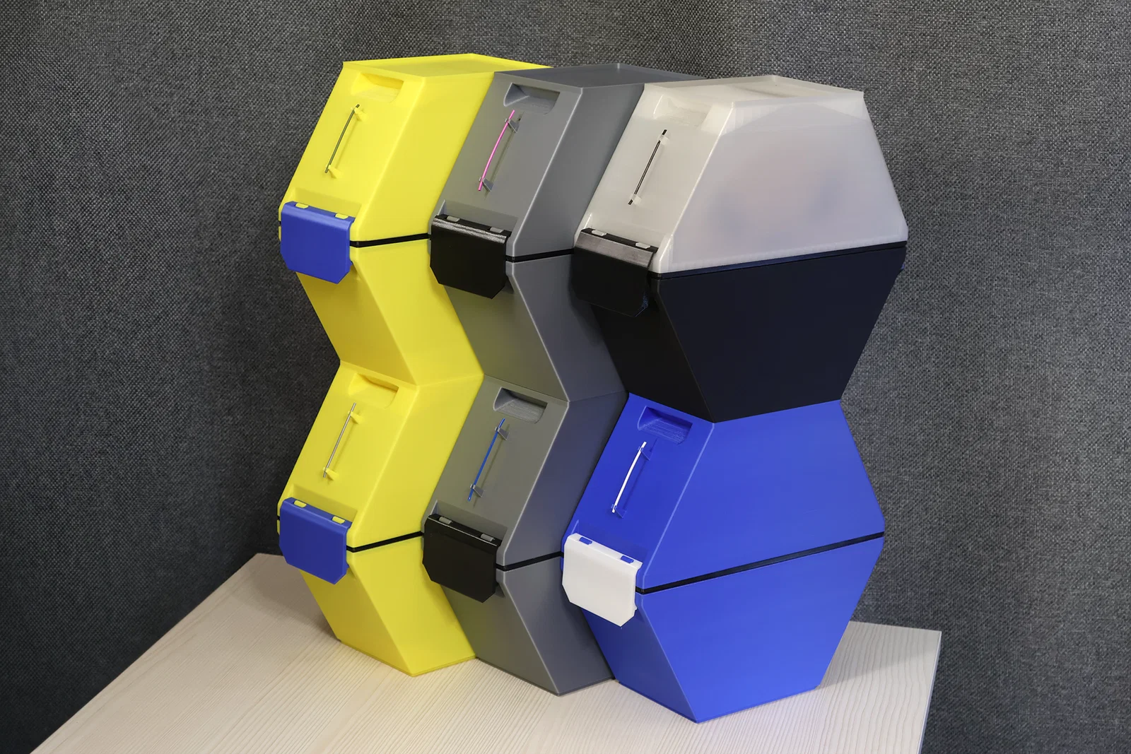 Các hộp được thiết kế để xếp chồng lên nhau, giúp lưu trữ filament gọn và linh hoạt theo chỗ làm của bạn. Hộp có thể đặt đứng hoặc ngang và có tay xách để quản lý cất trữ dễ hơn.