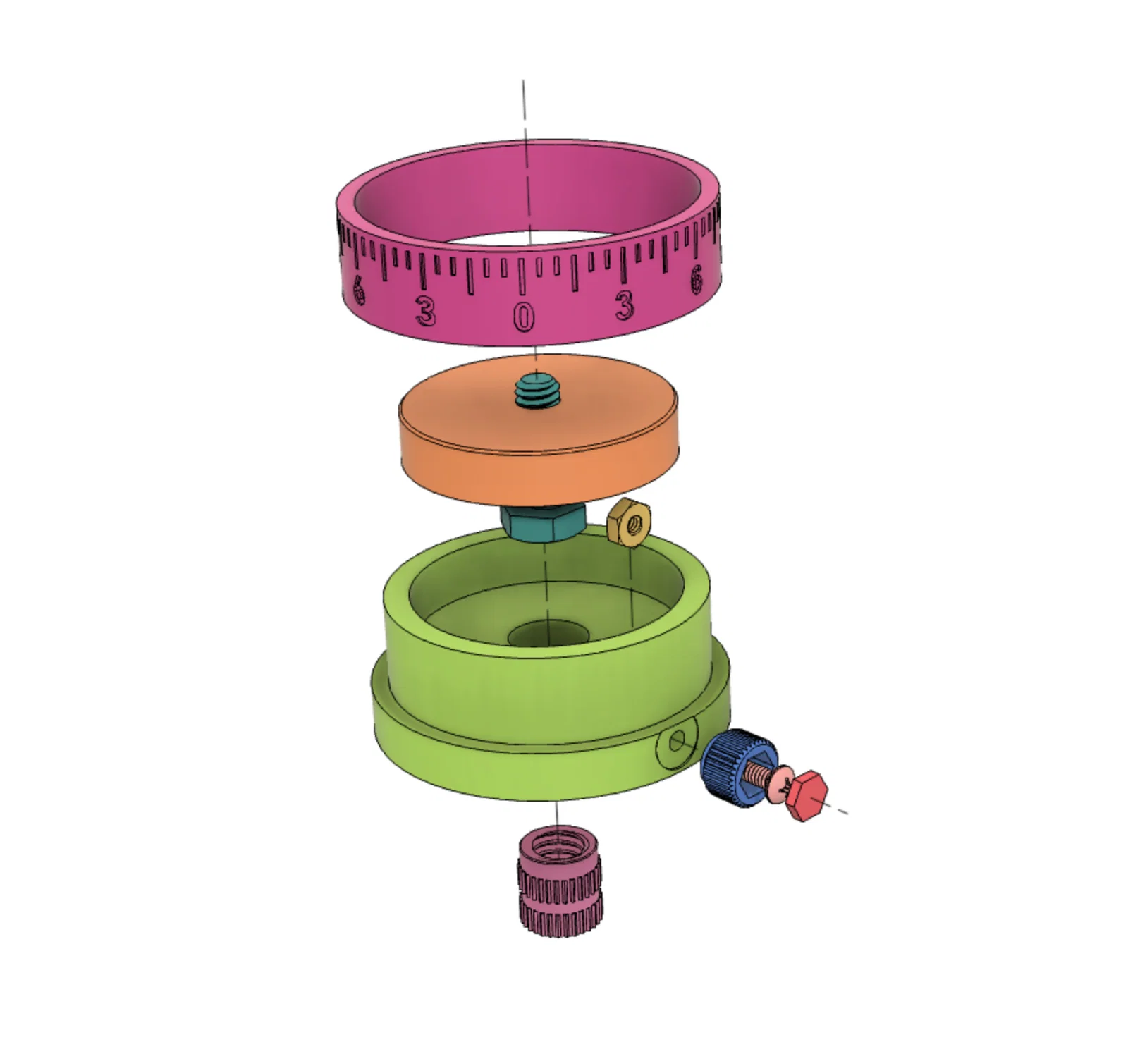 Mẫu trong hình được in bằng MMU để tô màu các vạch chia và con số trên thang đo xoay của tripod.