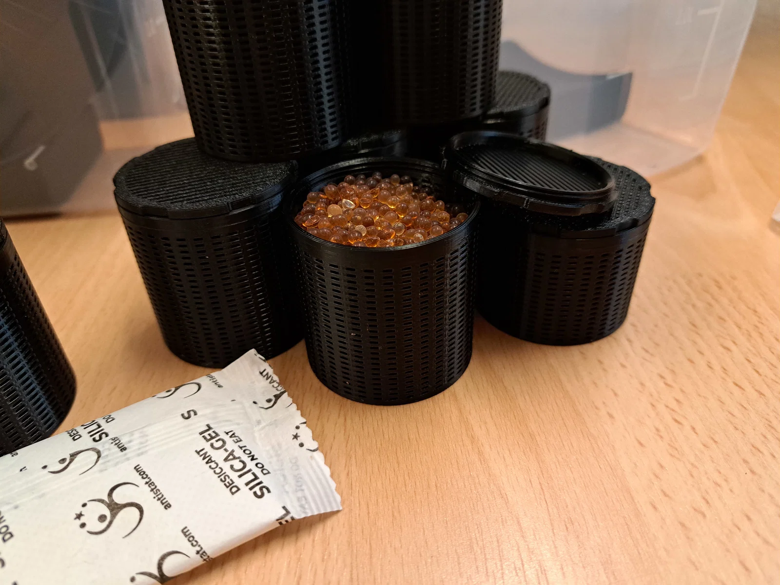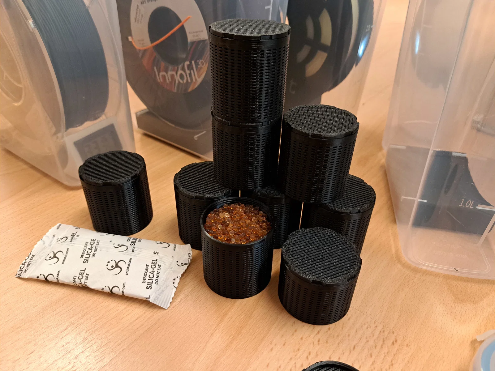 Hộp Silica Gel (Silica Gel Box) để nhét vào bên trong cuộn filament, có các lỗ rất nhỏ và khe hở 0.8mm cho hạt hút ẩm. Khuyến nghị in ABS hoặc PETG vì PLA dễ bị biến dạng khi sấy.