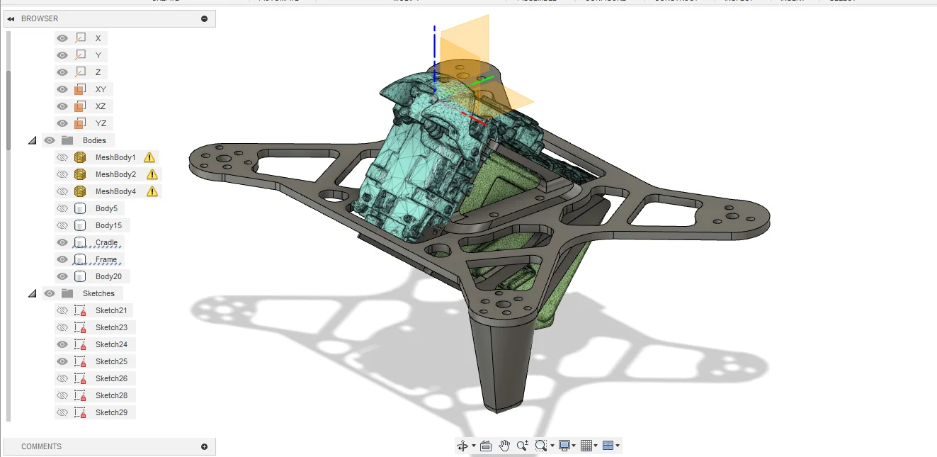 Con drone DJI FPV tuy nổi tiếng nhờ khả năng bay ấn tượng và nhiều tính năng xịn, nhưng lại hay bị chê vì phần frame khá giòn, dễ bể. Cái “điểm yếu” này làm drone rất dễ hư khi crash hay va đập, đúng là bất lợi lớn cho anh em nào hay chơi tới bến. Để xử lý chuyện đó, mình thiết kế một carbon fiber frame kèm cradle in 3D. Carbon fiber cho độ cứng và độ bền rất cao, giúp tăng đáng kể khả năng chịu đòn của drone. Còn cái cradle in 3D thì giúp ôm khít các linh kiện, thêm lớp bảo vệ và giảm nguy cơ hư hại bên trong khi bay gắt.