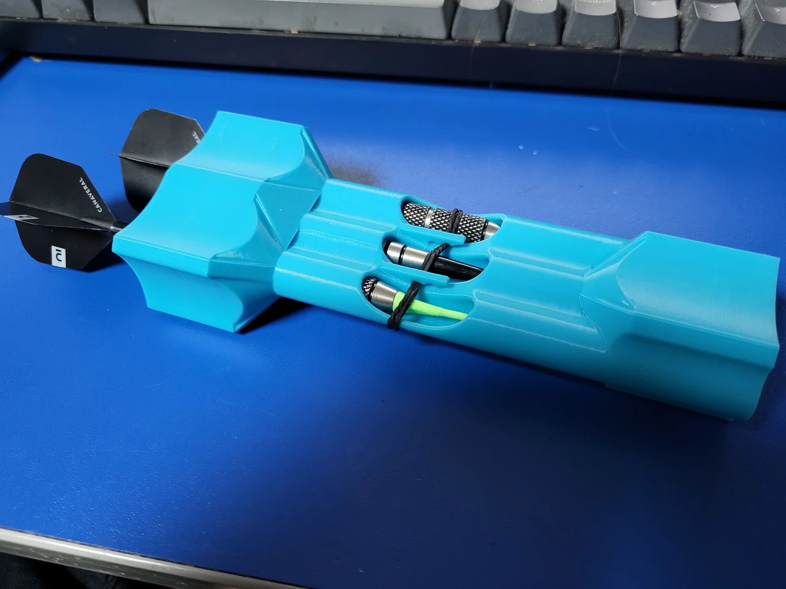 Vỏ/hộp đựng darts full size nhỏ gọn cho soft tip, thiết kế theo Decathlon Canaveral s560 18g (150×9mm). Trượt darts vào/ra nhanh, không cần tháo tips hay flights; có thể thêm dây thun để giữ chắc hơn.