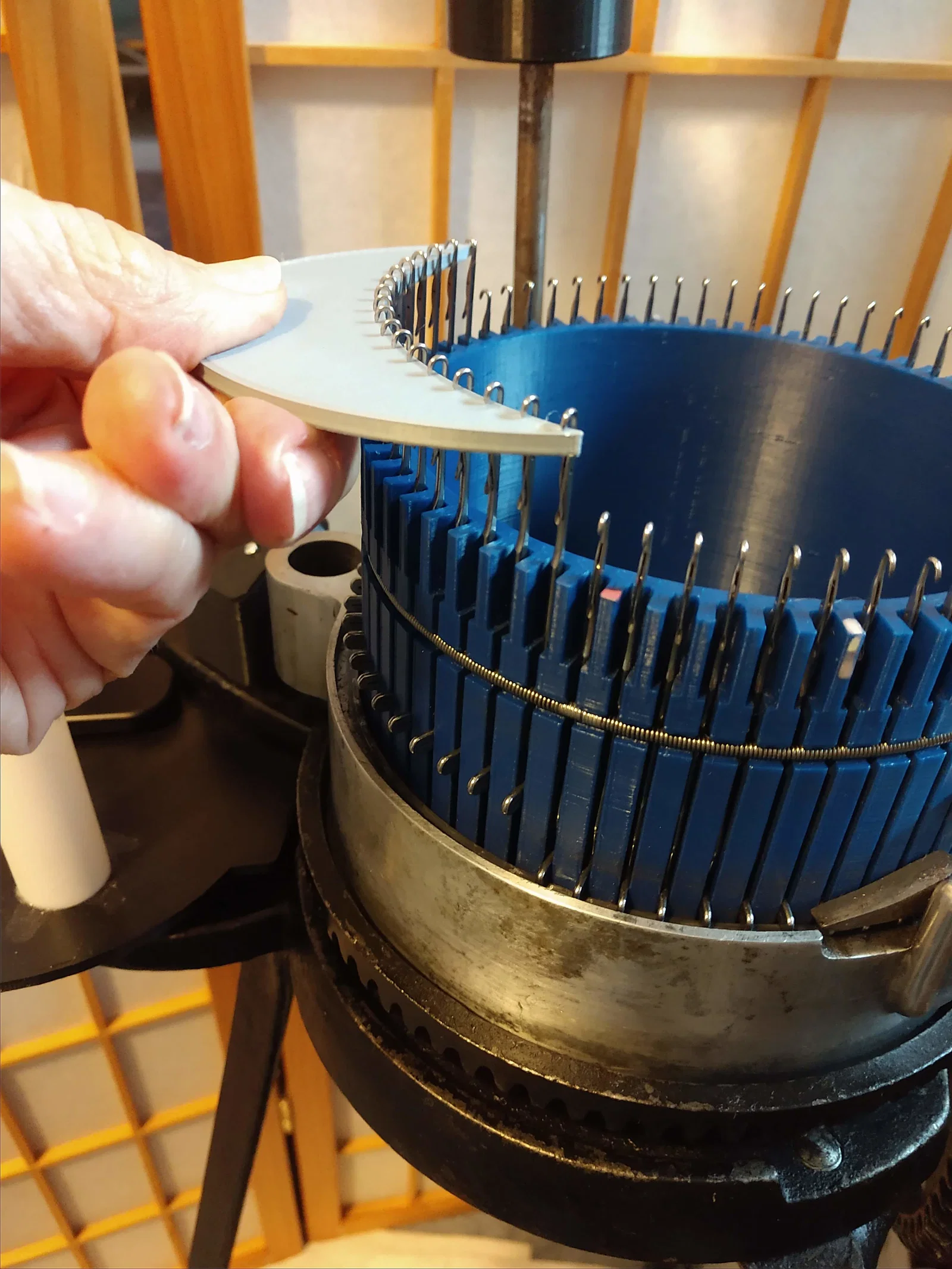 Chỉnh sửa bổ sung: Mình phát hiện ra cây tool này có độ dày chuẩn để dùng khi hạ kim xuống lại vào vị trí làm việc. Để nó tựa trên cam ring (Gearhart đời cũ) rồi dùng tay ấn kim xuống. Phần butts sẽ chặn lại nên kim vào đúng vị trí, mũi vẫn nằm dưới latch và latch vẫn mở!