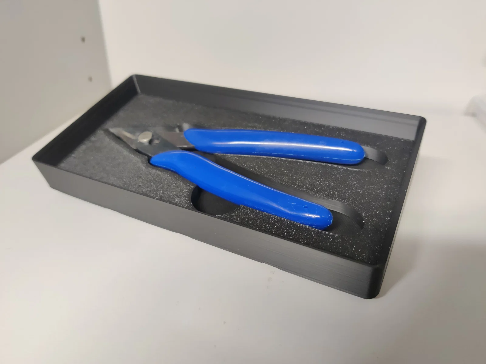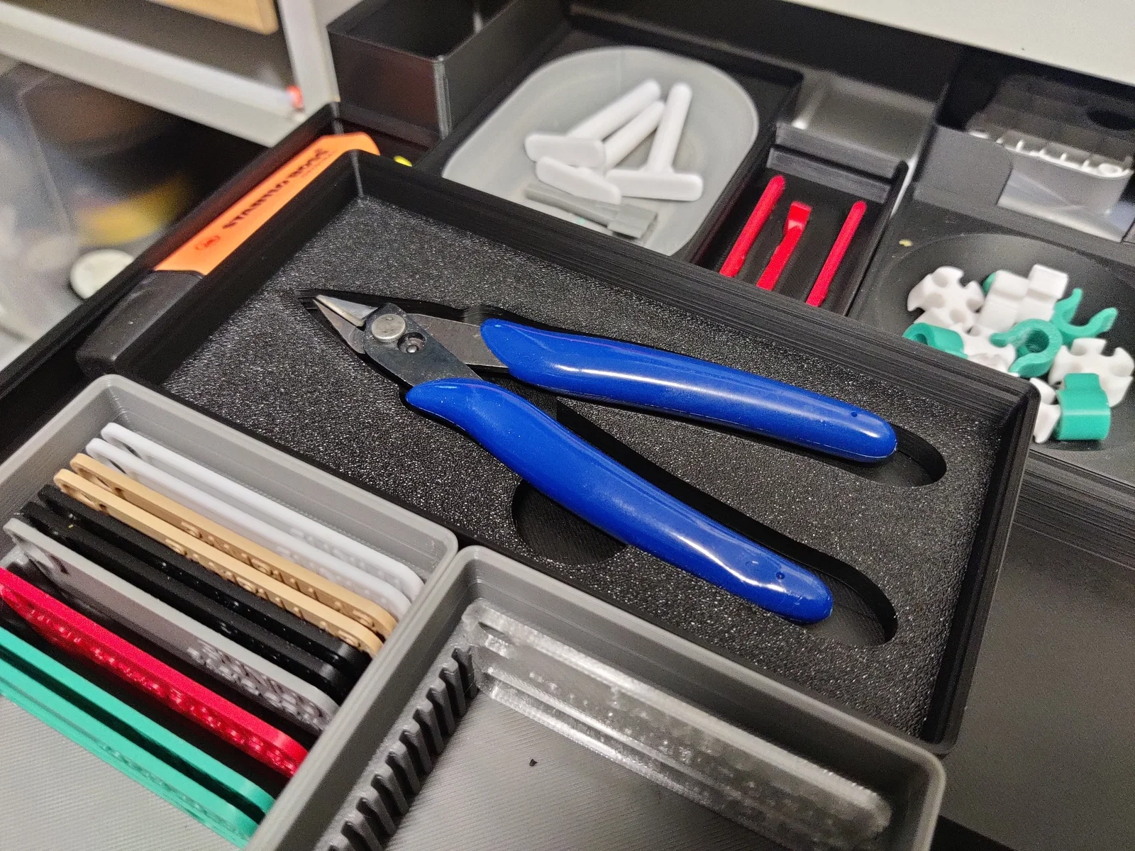 Một hộp Gridfinity dạng stackable kèm inlay để cất nhiều phiên bản kềm cắt cáp.