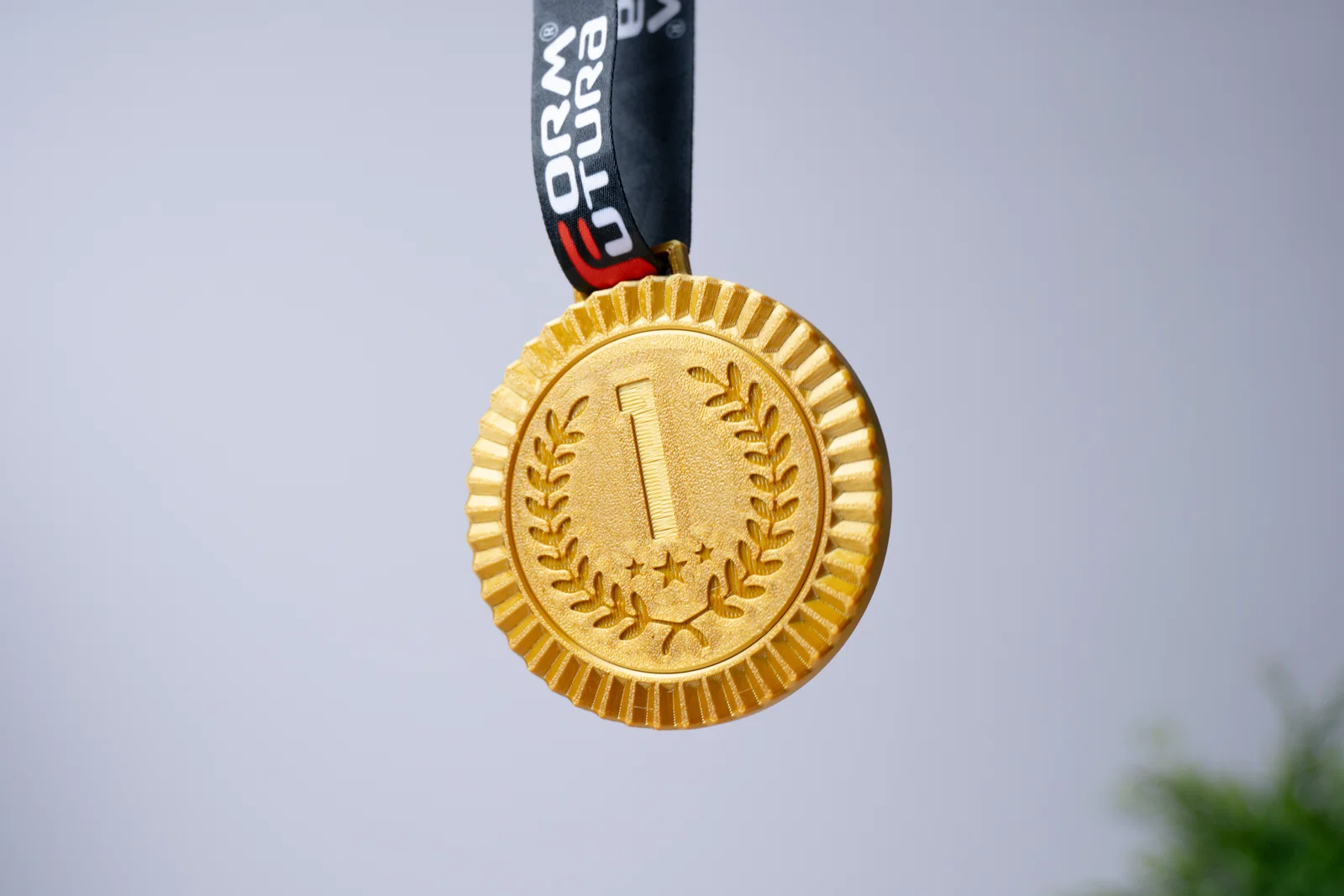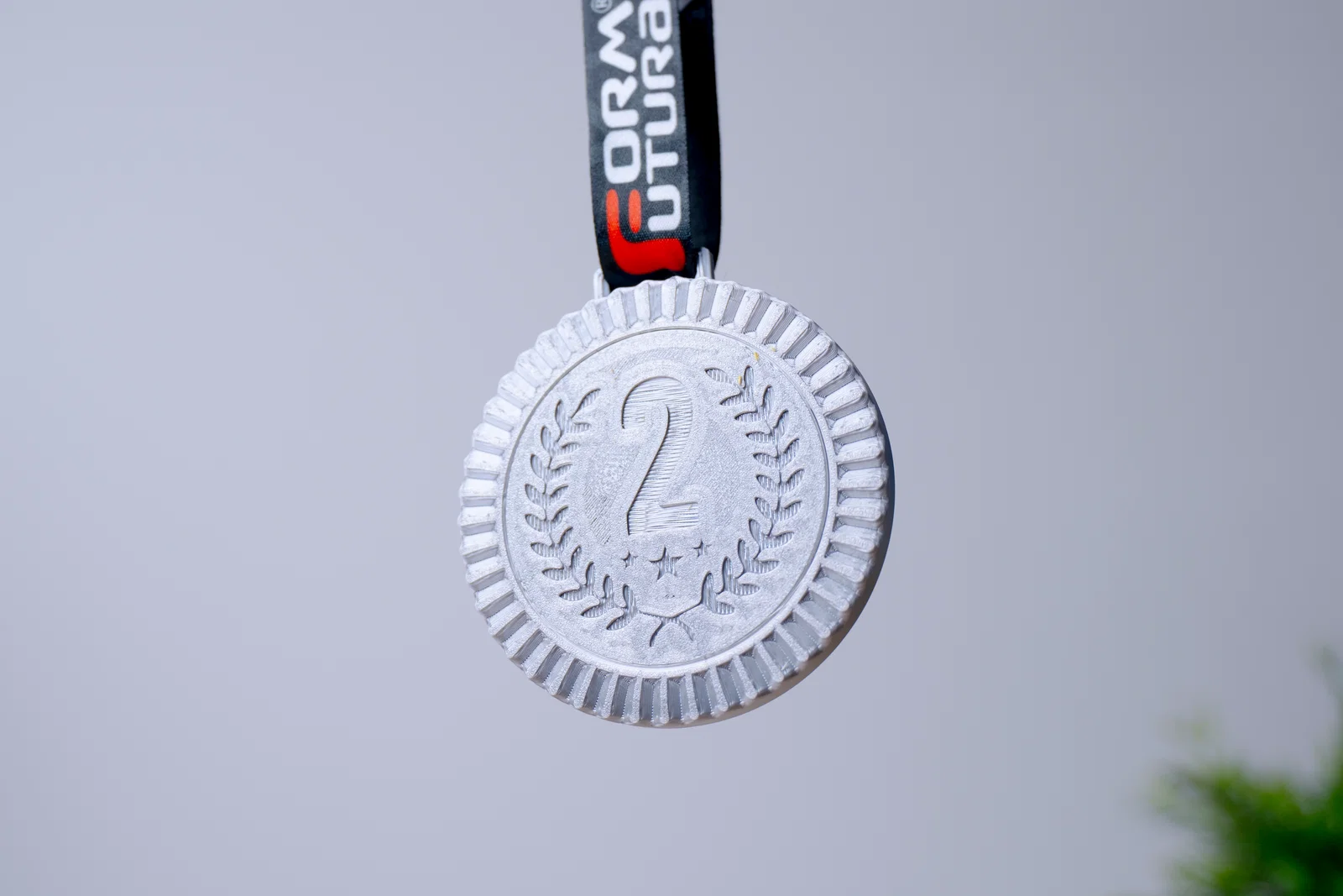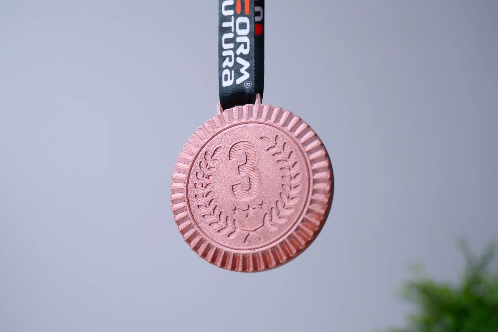 Mẫu huy chương in 3D với chi tiết sắc nét, hiển thị rõ hạng 1, 2 hoặc 3. Khuyến nghị dùng FormFutura High Gloss PLA (Bronze/Silver/Gold) và in úp mặt; chỉ cần support phần nhỏ phía trên.