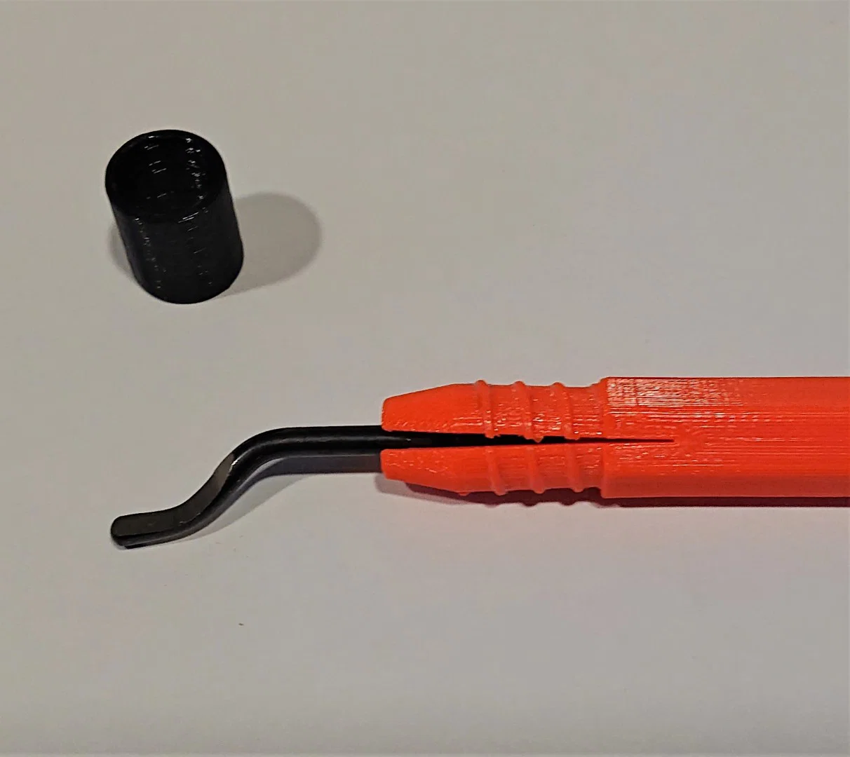 Tay cầm một khối cho lưỡi deburring 3.2mm: đầu có khe để ấn lưỡi vào và tự snap cố định, kèm vòng (ring) giữ chặt hai nửa. Có nhiều file fit khác nhau để lưỡi xoay mượt hơn và ring đã scale sẵn.