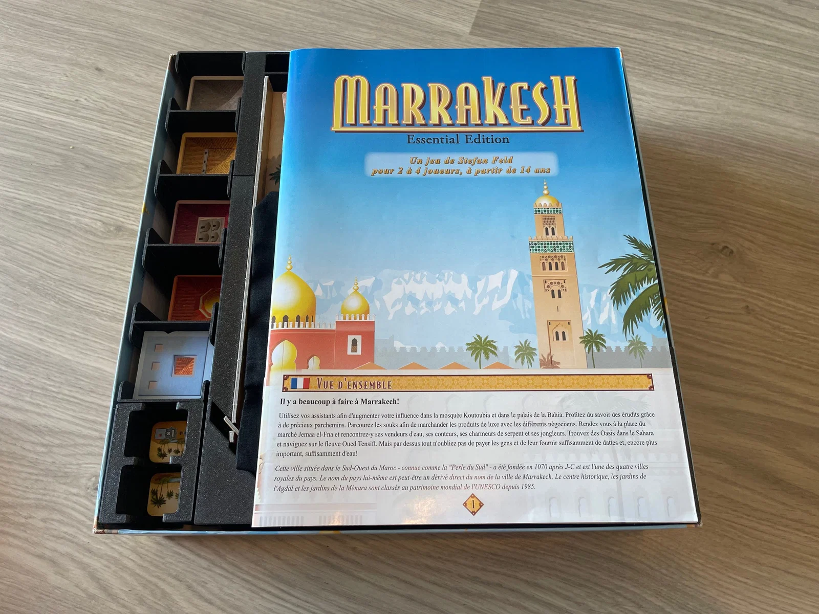 Insert/organizer full hộp cho Marrakesh bản Essential Edition kèm Deluxe Component Upgrade Pack. Thiết kế giúp set up nhanh, sắp xếp gọn; có lưu ý file X2/X4, phần garden cần cắt bằng Slicer nếu máy nhỏ, chữ khắc tiếng Pháp.