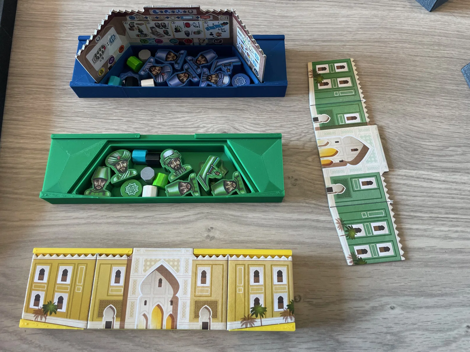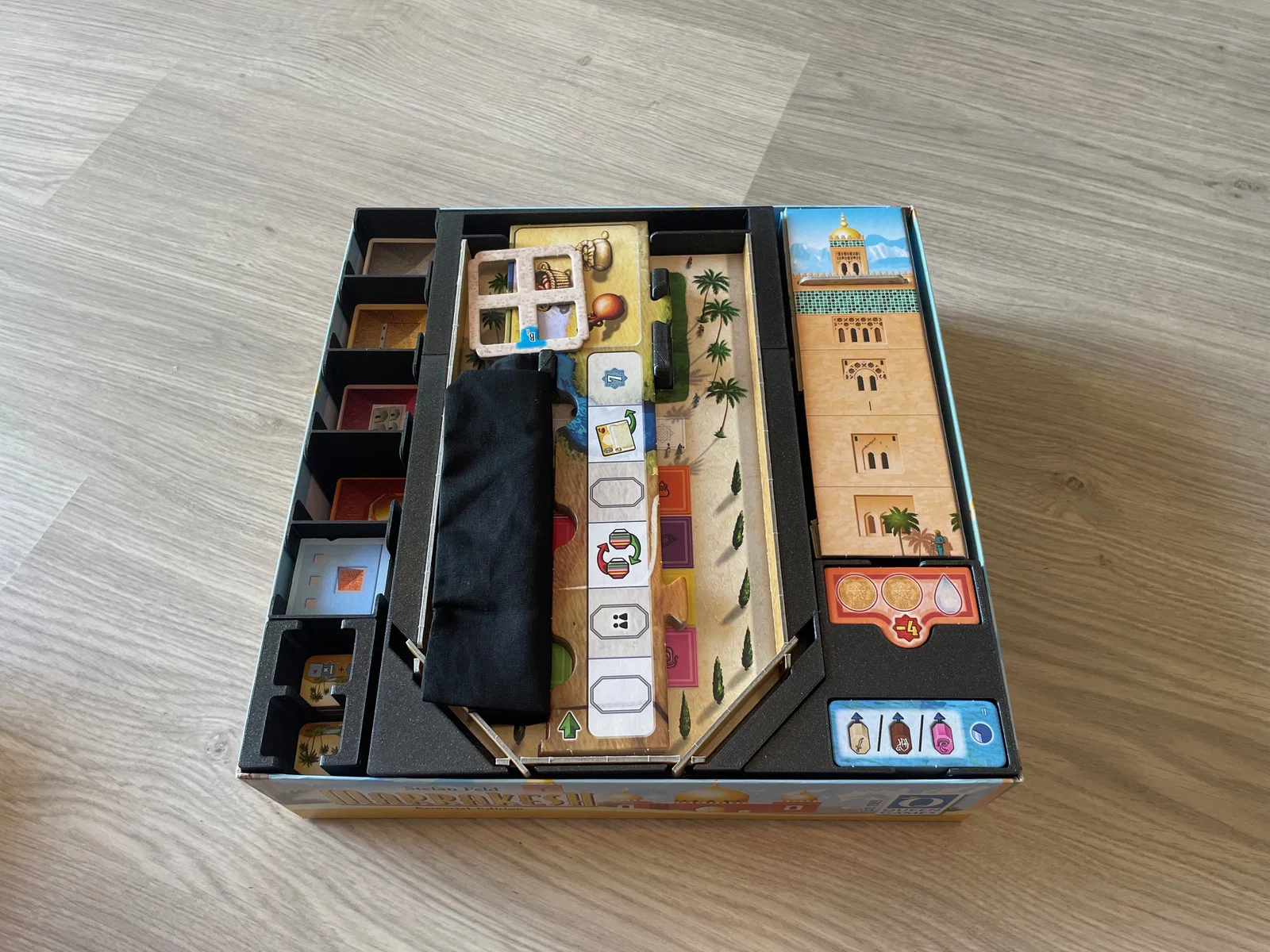 Đây là bộ organizer đầy đủ cho hộp Marrakesh bản Essential Edition, kèm luôn gói nâng cấp Deluxe Component Upgrade Pack (hộp vẫn có thể dùng cho bản không có Deluxe Components, NGOẠI TRỪ phần cửa thành phố (city doors) — chắc bạn sẽ phải tự làm/thiết kế một hộp thay cho cách mình làm cho phần cửa).