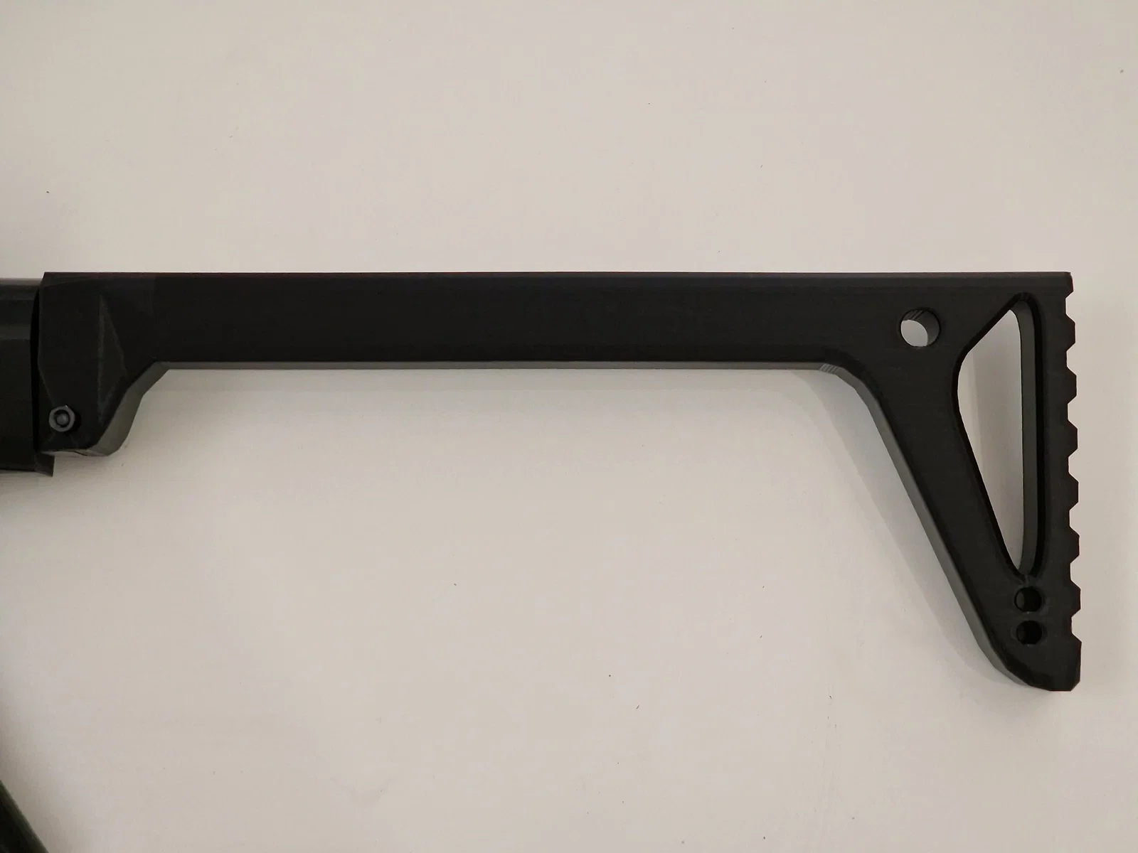- Mẫu gốc có báng (stock) gập/rút (collapseable). Báng này khi in 3D thì khá mềm, và phần rút sẽ không hoạt động nếu không chừa khoảng hở phù hợp giữa lower receiver và upper receiver. Vì mình muốn báng ổn định hơn nên mình thêm một mảnh picatinny dạng modular, để bạn dùng báng đơn giản mình làm sẵn hoặc gắn báng khác tùy ý.