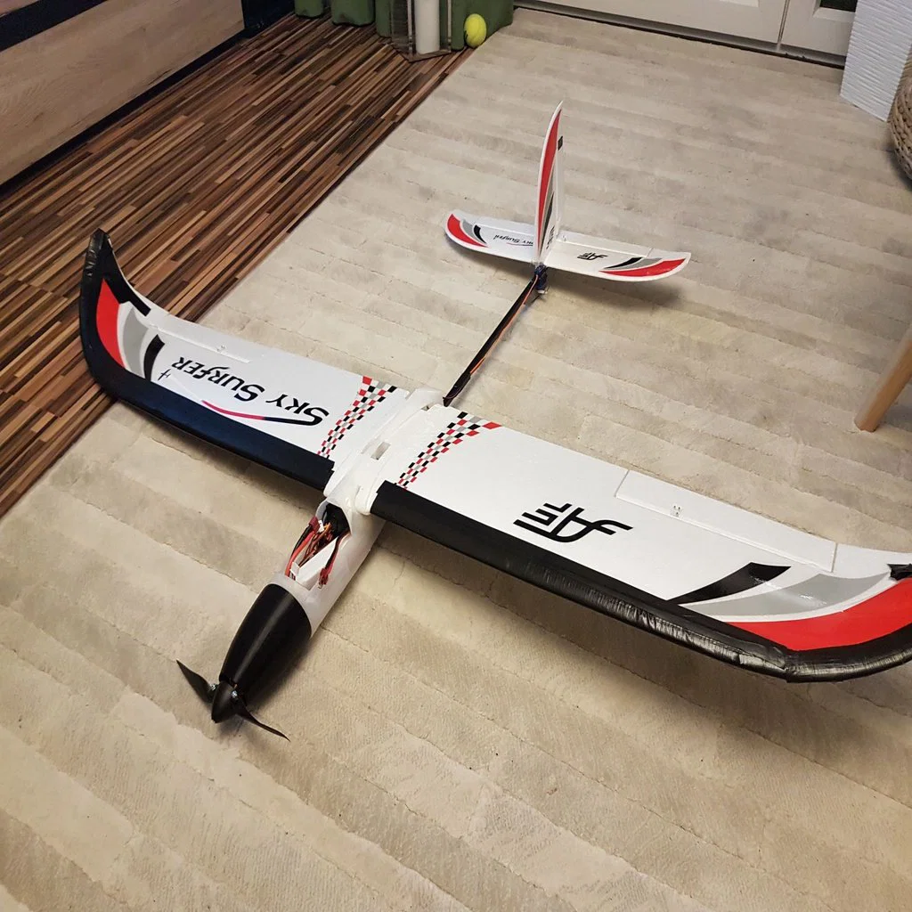 SkySurfer bản gốc là một motor glider rất ổn, nhưng mình không thích kiểu đẩy cánh quạt nằm sau cánh (mình không bay FPV). Với lại mình muốn thân máy bay ổn định và cứng cáp hơn so với fuselage bằng mút EPP. Nên mình làm ra mẫu này. Và mình khá hài lòng, theo ý mình (IMO) thì nó bay tốt hơn bản gốc.